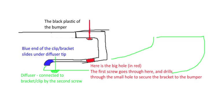 Basically, each clip uses 2 screws: Image 1 & 2: The first screw holds the clip on your bumper (you can use a screwdriver to drive it in, but be careful of the placement), and passes the big hole through to the small hole (which is the side that will actually hold the clip to the bumper) In the first 2 pics, you can see the back of the clip (which faces the rear of the car), where it is screwed into the soft black plastic of the rear bumper. Image 3 The second screw is put in after you pull the diffuser edge over the long end of the clip (the diffuser tip has a little ridge that should slide right over the bracket/clip) Image 4 & 5 These 2 pics give you and idea of the locations of the 2 screws It should look something like this (pardon the crappy MS paint): |