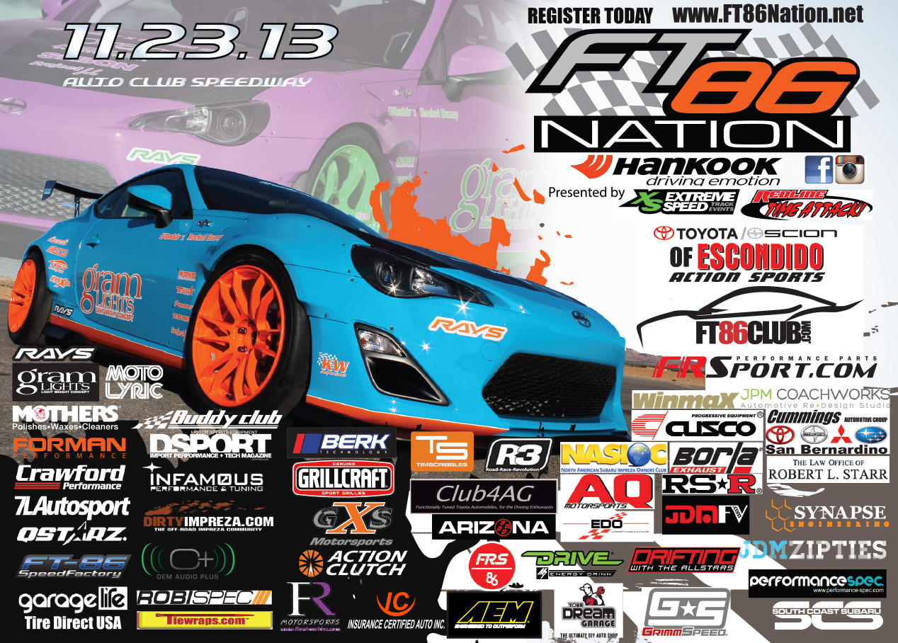 ![]() 86 Dynamic Driving Academy, Stage 4: AUTOCROSS SCHOOL will be held in conjunction with "86 Nation" Event on November 23rd, at Auto Club California Speedway at 9300 Cherry Blvd, Fontana, CA. This will be a first com-first served spots for 25 entries at $70+ $15 gate fee. It is reserved for AE86 drivers, and Scion FR-S/Subaru BRZ drivers, and is for novice, and intermediate drivers. For advanced drivers, there is a normal autocross session operating at the same time, with difference sessions. You can pre-register online for autocross at www.86nation.net/autox OR check in on the day of the event early in the morning by 8am. Registration AutoX online Registration cost is $70 and closes on Friday the 22nd @ 9pm. You will need to pay the $15 gate fee to enter FT-86 Nation so please have cash available for the gate fee. Or find the AutoX registration @ the FT-86Nation info booth to register the day of the event. Space is limited and you should register online to guarantee yourself a spot. If you registered online use your ticket showing you paid to enter or bring cash. You'll also need a valid driver’s license. Numbers will be assigned upon arrival. Cars may be required to install a windshield vinyl from one or more of our sponsors. No Work Assignments! Unlike most Autocross formats, we'll have staff so you don't have to work when you're not running. This way you can enjoy the event! If you do feel like working in exchange for a free AutoX entry, please let us know as we could use one or two more staffers. Preparing Your Car / Tech Inspection Remove all loose articles from the interior of your car! At the “tech” area, you will be asked to open the hood, trunk, and interior of your car for the Tech official’s inspection. They are here to make sure that all cars competing are safe. They will inspect your tires for adequate inflation pressure and tread depth, your wheel bearings for wear, check that your battery is secure, throttle return springs for return, etc. If the tech officials are satisfied with the safety of your car, your time card will be initialed. Helmets are required and limited loaners will be available (snell 95 and up). |