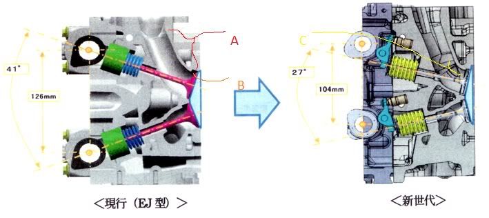 I was most interested in this one: ![]() Like you said, the new motor's intake ports look more curved than the old EJ. Especially where I marked it with 'C'. This is not what I think of when I think of performance ports. Air doesn't like to make sudden volume or direction changes, and compared to the old one (The section 'A') the EJ's intake looks much better. But I'm not an engineer either. One issue that confuses me is the step right before the valve ('B'). I don't know what this is. I though it was maybe where the valve seat is supposed to go but all the other components are there, so maybe not. It could be there to introduce more turbulence as the air enters the chamber. A reason for this could be the EJ's larger than usual bore. This leads to a big flat pancake-shaped combustion chamber which means the burning fuel has farther to travel. This can make for less efficient combustion but having the intake charge swirling around more can help improve that. It also shows that they went from buckets and shims to finger-followers which are lighter and have less friction. Nice find. Now to wait for Ichitaka to maybe, perhaps, do some translating...?