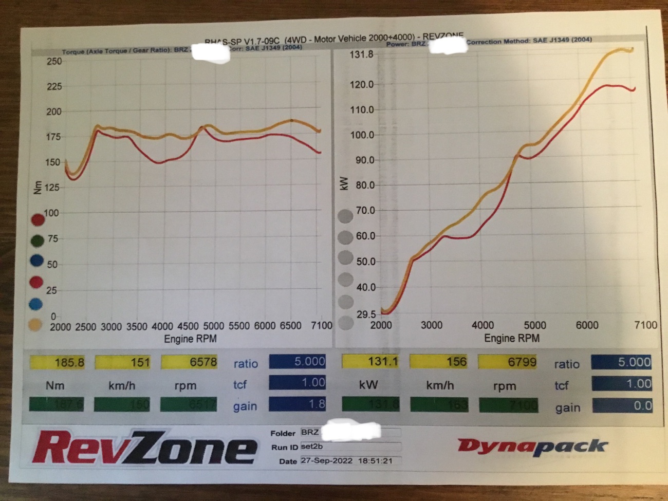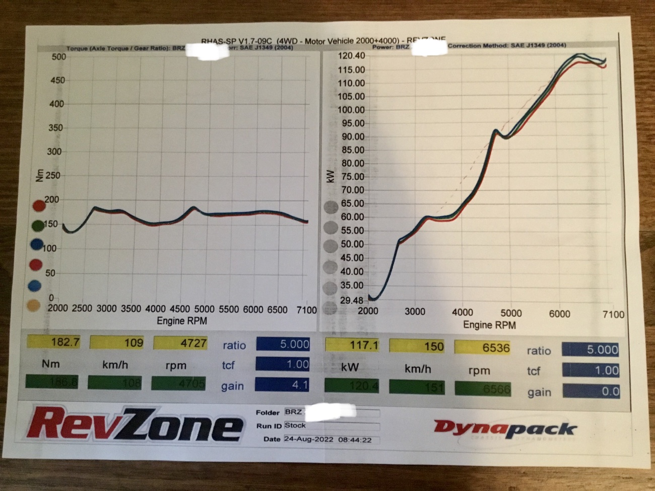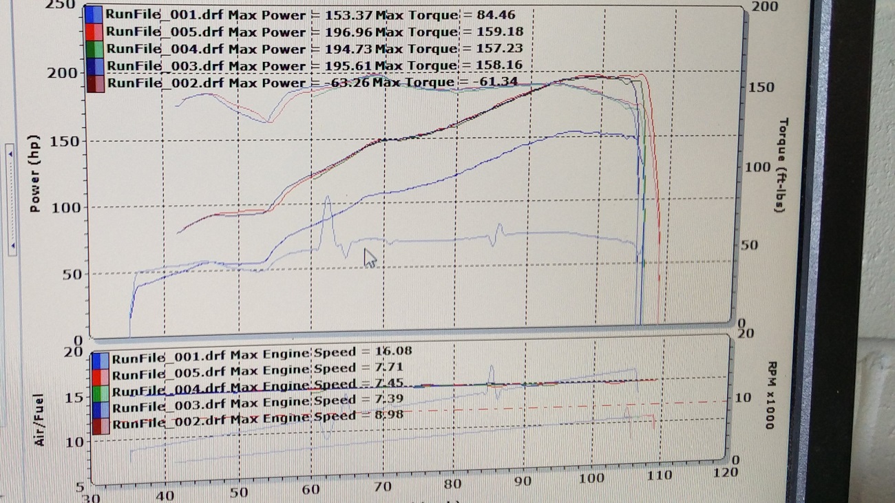 1st dyno pic are “stock” (Mishimoto inlet tube and STI axle back exhaust) runs.