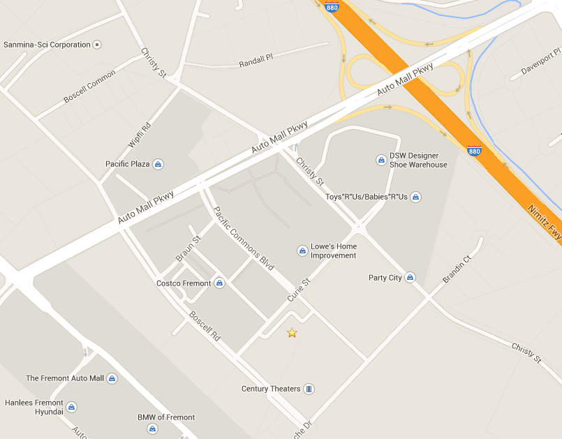Exit from 880 to Auto Mall Parkway and head West. At the intersection of Pacific Commons and Auto Mall you will see an In-n-Out. Turn left at this intersection and continue past In-N-Out on Pacific Commons until you see the restaurants on the right side. If in doubt, look for the new Century movie theaters and park at the corner of the lot, closest to the restaurants (WW/KK).