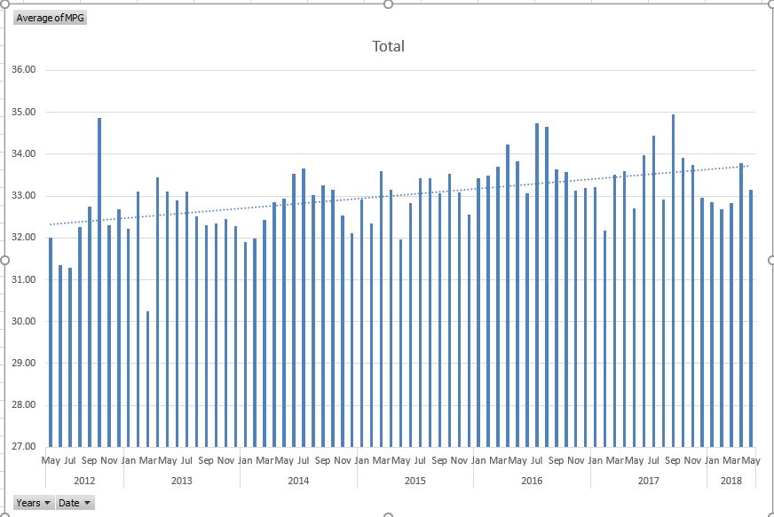 Overall, pretty minor and mostly expected stuff. The paint still looks good when clean (at least from 50 feet) and I still enjoy driving it every day. If you read the original post here you know I track my mileage pretty closely. Interesting that the MPG continues to trend up even though I have not changed the plugs. I have not changed my driving style, so not sure what accounts for that.