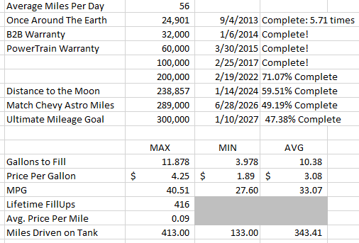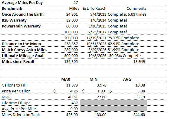 OK, technically a day early.....but since I filled up yesterday I figured it was time for my annual roundup of where I am with some of the "mileage goals" I've been tracking since purchasing the car. So here you go: