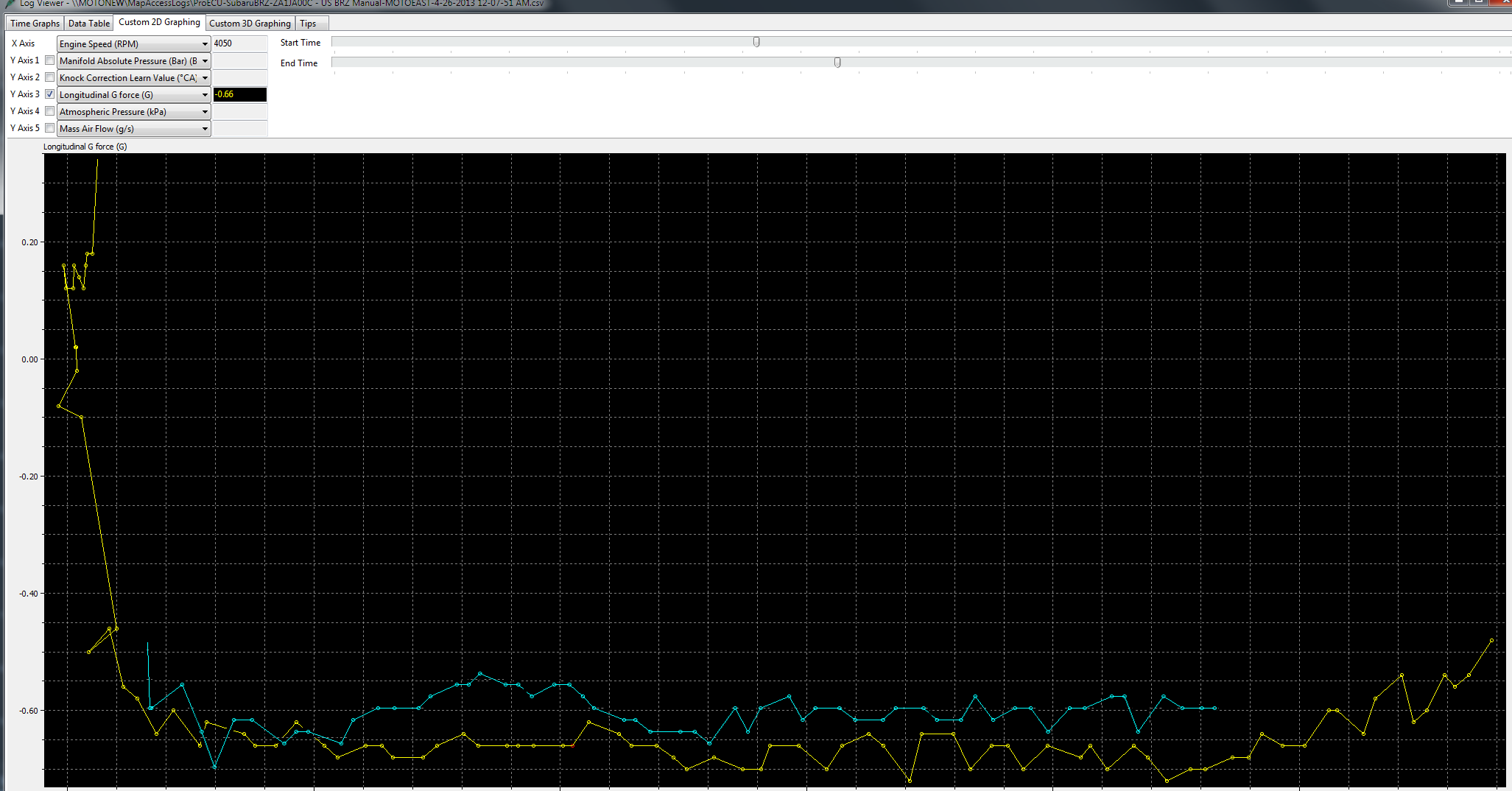 And the overlay of the g meter readings (upside down torque curve) of a stock BRZ (no passenger) vs E85 and header + 220 lbs (should account for the e85 difference). Something seems different about the shape 3200-4200