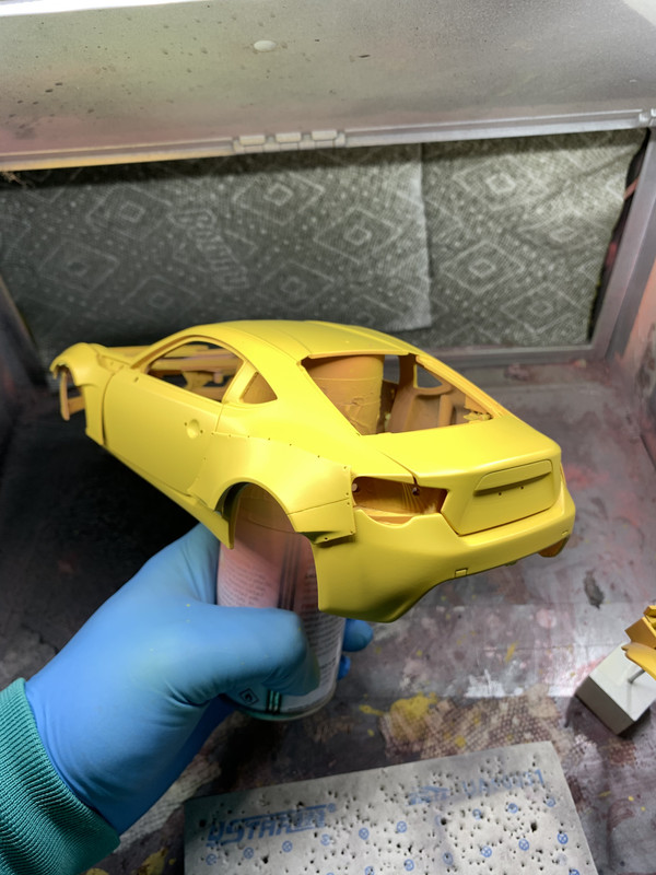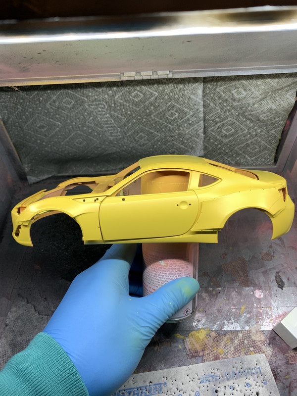 Rocket Bunny V1 kit getting some Honda Phoenix Yellow. This is a fully opening 1/18 Autoart diecast metal model, and I'll be slapping a 2JZ into it probably.