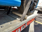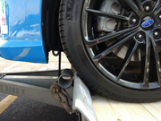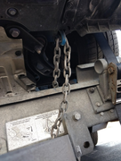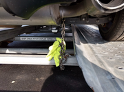 What redlined600 says about bringing the necessary planking is spot on, and it echoes what U-Haul recommends for low-clearance vehicles. I bought four planks to ease the approach angle (laid them down side by side so that I didn't feel like I had to drive on a balance-beam for loading and unloading), then had a fourth cut into smaller pieces as per U-Haul's recommendations. . ![]() You can see that the lip would have trouble clearing the front of the U-Haul trailer without the 2" lift from the planks. ![]() Here is a shot of the "wheel basket" over-the-top straps built into the U-Haul trailer. ![]() Front chain, supplied by U-Haul. Seemed to work well enough. ![]() Finally, here's the rear U-Haul chain, since there weren't traditional tie down rings available for the straps I borrowed. I put the fluorescent rag in there so I wouldn't be an idiot and forget to unchain in my excitement at getting the car home. ![]() Everything worked as intended, and the trailer tracked behind the truck [I]really[I] well, which was a nice surprise driving through some narrow construction zones. Okay, hope this works. I'm not skilled at posting images.
