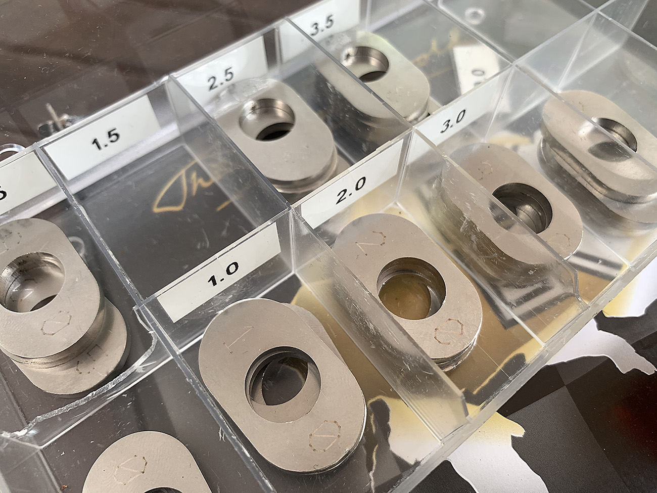 A lovely little box was part of the shipment, packed with the camber 'bushings', (all laser engraved with their settings), and the little rebound/compression adjustment tools.