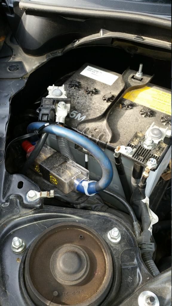 You can barely see the wire here. Its sitting just above floor level on the side. ![]() This is up under the dash, passenger side ![]() Coming out into the trunk ![]() Going through the firewall, left of battery ![]() I don't have it hooked up ATM because my stereo isn't in. (I pull it out at times for autocrosses and the like) ![]() Give me a bit and I'll try my paint skills at a wiring diagram, and explanation of how I'd wire it. |
