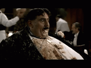 ![]() ![]() ![]() ![]() ![]() ![]() Maitre D: And finally, monsieur, a wafer-thin mint. Mr Creosote: No. Maitre D: Oh sir! It's only a tiny little thin one. Mr Creosote: No. Fuck off - I'm full... [Belches] Maitre D: Oh sir... it's only wafer thin. Mr Creosote: Look - I couldn't eat another thing. I'm absolutely stuffed. Bugger off. Maitre D: Oh sir, just... just one... Mr Creosote: Oh all right. Just one. Maitre D: Just the one, sir... voila... bon appetit... [Mr Creosote somehow manages to stuff the wafer-thin mint into his mouth and then swallows. The Maitre D takes a flying leap and cowers behind some potted plants. There is an ominous splitting sound. Mr Creosote looks rather helpless and then he explodes, covering waiters, diners, and technicians in a truly horrendous mix of half digested food, entrails and parts of his body. People start vomiting.]Maitre D: [returns to Mr Creosote's table] Thank you, sir, and now the check |