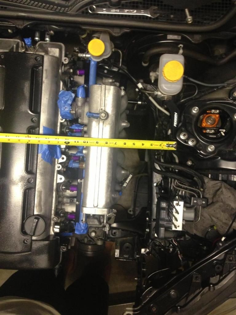 Wastegate/exhaust, plenty ![]() Turbo/manifold, move my fusebox and I can fit virtually any size turbo on this PHR S45 manifold. ![]() Intake, only small issues are aft side of fuel rail. Engine will probably be moved up another half inch or so and that should account for heater hoses as well. ![]() Forward. Sits 1.5in above current radiator mount. Might mod it for more clearance but it's good currently. The vertical brace that runs between both the radiator support on the bottom and the hood latch area needs to be cut off, braced otherwise.