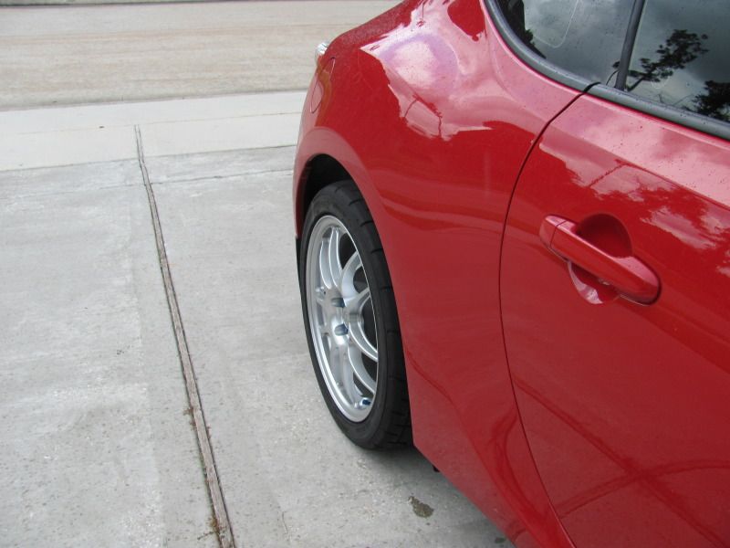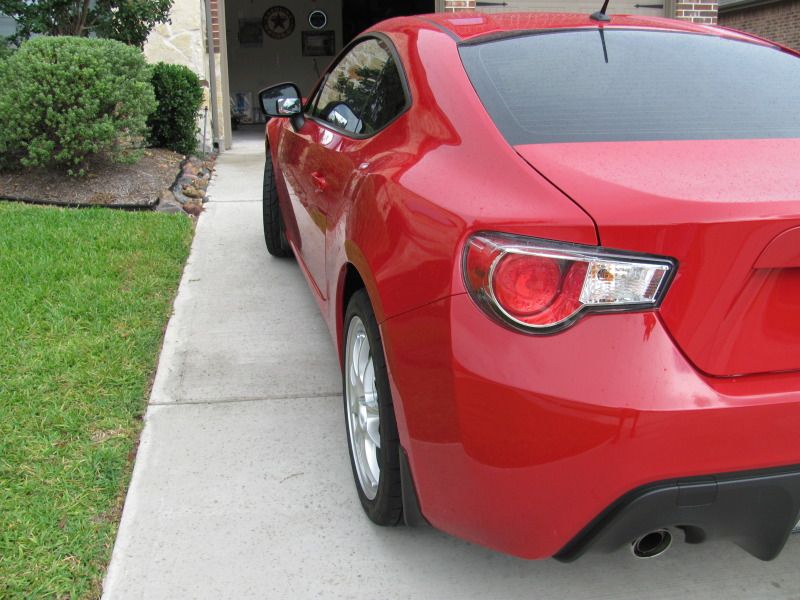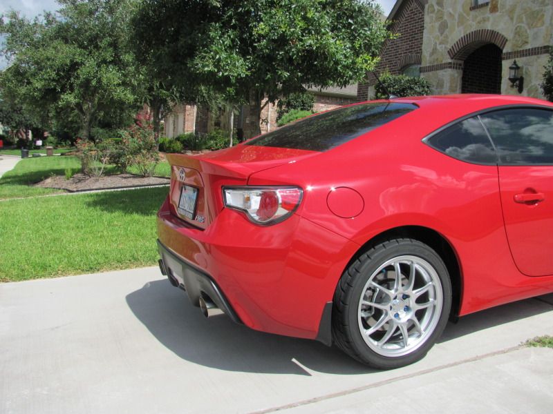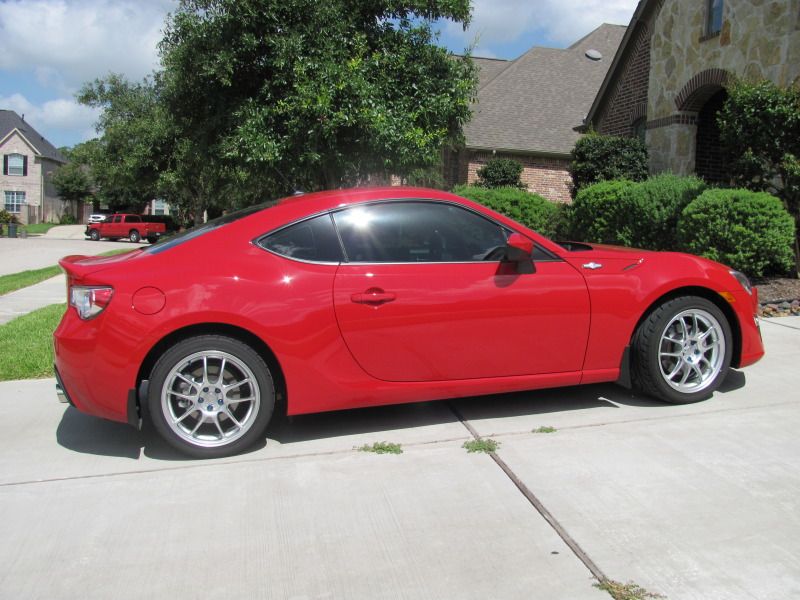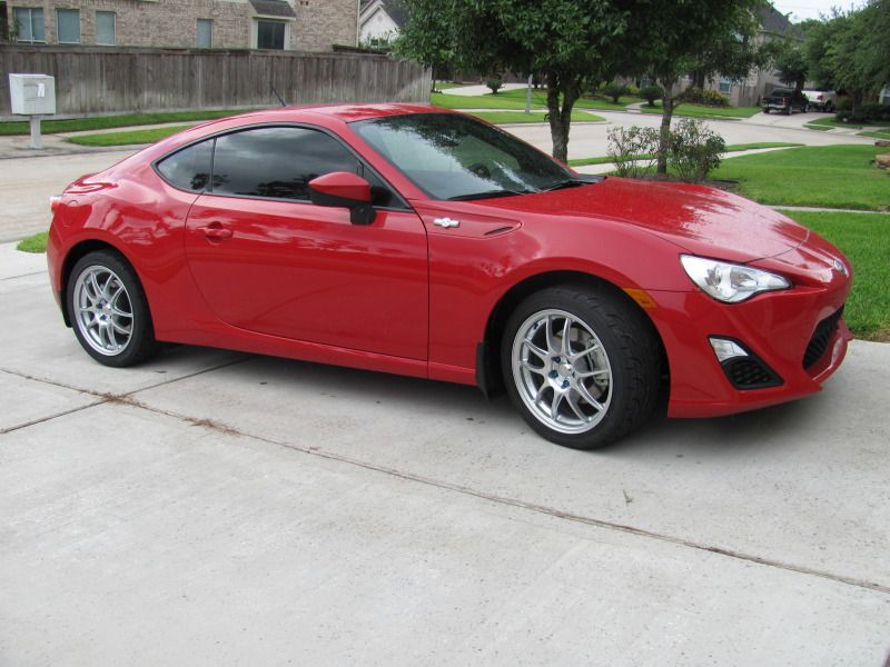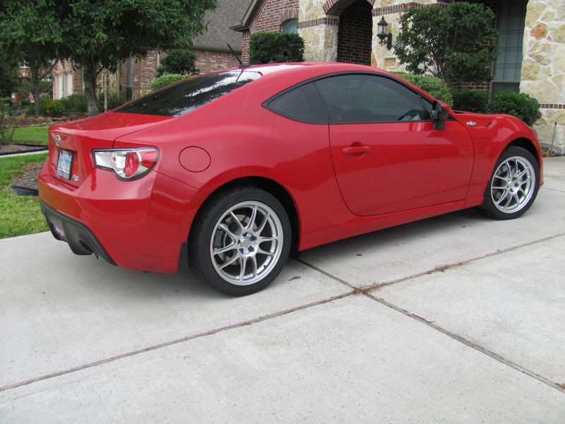 Got in some track time @ Texas World Speedway a few weeks ago. The 2.9 mile road course is considered to be a high speed course that can be hard on brakes. Nearly 14K on the odometer now. The only change made since I last posted here was to add Carbotech XP10/XP8 track pads and ATE Blue fluid. This was a OTD (open track day), with 4 solid hours of open track. I ran the car for 4 25+ minute sessions, for a total of ~140 miles on track. I had been concerned about how well the stock suspension would handle the extra grip of the wheel/tire upgrade. I was very pleasantly surprised. The car has impressive grip with this setup, with just a bit more roll than I'd like. I have some Whiteline sway bar bushings on backorder that should help with that. I was also impressed with the handling on my Ohlins suspended NC Miata, which had upgraded Eibach sways, a fairly aggressive track alignment and the same tires. The 86 was at least as hard to break loose in the high speed turns of TWS, and when it did, it was much easier to get back. I'm guessing the low CG and width of the 86 enables the car to handle this well with the lower factory spring rates. The 1st thing I noticed when I opened the hood on one of these was just how low they got the engine. I'd guess your butt is no more the 9-10" off the ground in the factory seats. Take another 3" down with a race seat, drop the car 1" and things will get really low. I did take the 86 in and have the alignment checked, making sure I had all the available negative camber, and setting front tow to "0". Theres definitely much more in the car with an upgraded suspension, but it will be a challenge to match the excellent balance of the factory setup, not to mention the street-ability & comfort. As it stands, the sway bushings are the only suspension changes I plan to make for now, since I had no sign of accelerated wear on the tire shoulders, and tire temps were consistently within 10 degrees across the tread. BTW, there is more rubber room than with my previous 2 cars, especially the NC Miata which needed a mild fender roll in the rear for the same size tire. Power delivery is very linear, with acceleration falling between the S and NC. The 86 seems to have better low end than either car, and feels quicker than the Miata across the power band. NA power in the S was good, but occasional mid turn Vtech hits proved to be sketchy for me, resulting in at least one spin IIRC. Braking was very confidence inspiring with 0 fade and minimal dive. Heel/toe is easier for me in the 86 than the other cars. The fact that this car has a roof not only stiffens the chassis, but eliminates any track specific "broomstick test" infractions that were always a concern with my S2000CR and Miata. The cockpit setup is excellent for me, and the shifter feel is best of the 3 IMO. At ~ 5'8", in my (factory) seat position, I felt 1-1.5" of clearance between my Bell Pro4 and the headliner. Outside temps were mild, and I had no cooling issiues. We'll see if that holds true in the heat of the Texas summer, but I suspect it will. My Miata would puke coolant without a good cool down. Seats proved to be on par with the upgraded seats in the S2000CR, but regular track days would have me searching for hardware to get my Sparco seat and a harness in the car. The poor seats in the Miata sparked the race seat purchase. With the extra cargo area and fold down rear "seat", and the 86 sees much more DD/road trip use than either of the previous roadsters, and averages ~30mpg while doing it. Oil changes on the 86 are very easy, with the filter up top and a well place port in the undertray for drain plug access. The S comes in 2nd in the ease of oil change department, and the Miata a distant 3rd. Street wise, its just much easier to live with. I believe the car is the best out-of-the-box value out there today, and the aftermarket has jumped in with both feet. I think this one's a keeper, for my foreseeable future.