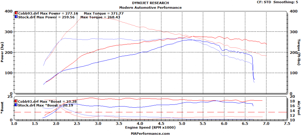 Hey guys! Finally got the Cobb Accessport installed and did some testing of of their maps. This was all done on stock everything. Not a lot of top end power, but does keep it from dropping off compared to the stock tune. But noticeable gains in the mid range for sure! Not a big difference between the 91 and 93. We will see what we can do with our custom tune soon.