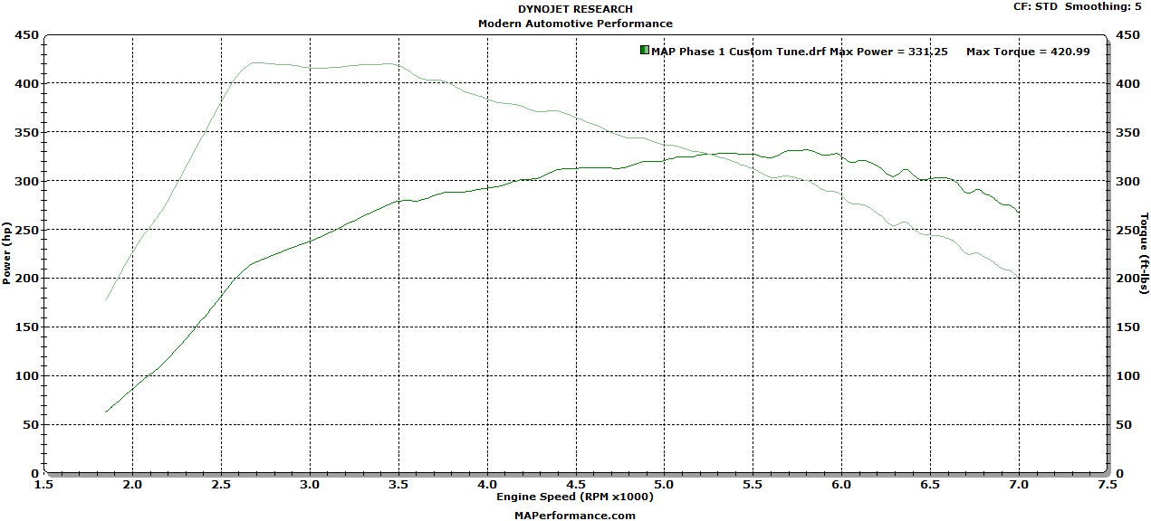 Well, we pretty much have our phase 1 done with the car. Intake, downpipe, catback, and custom tune (still on stock intercooler and piping). Here our the final results from that: