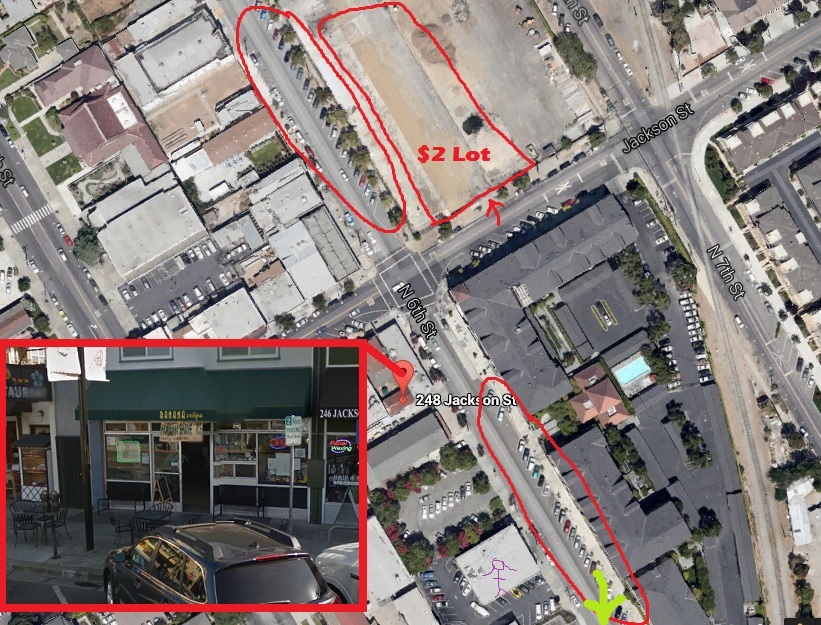 That parking lot is way too steep and not enough parking for all of us!! There's a whole street of empty parking on 6th right before e Taylor!!!