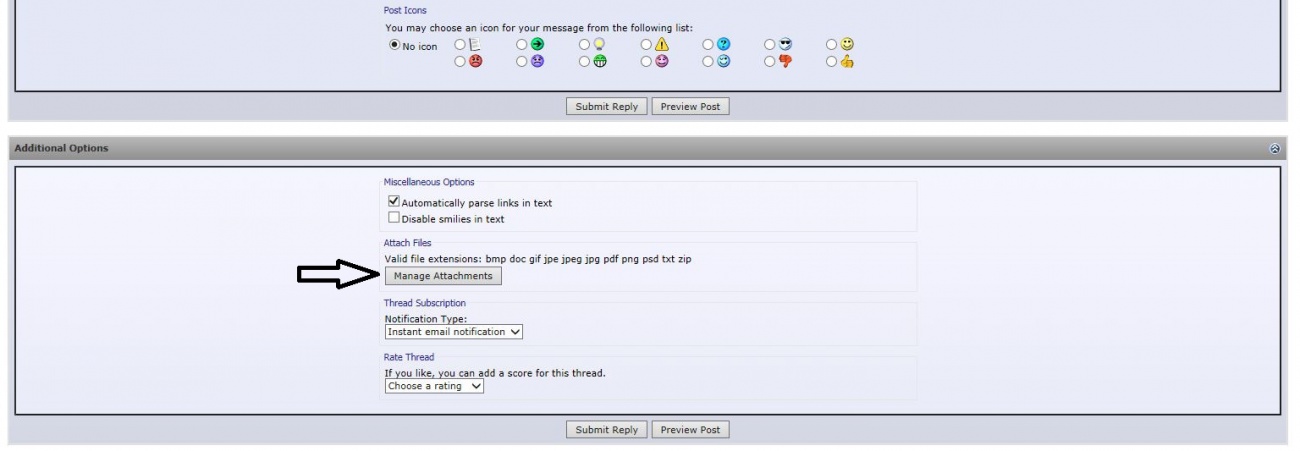 If you wish to use one found on your computer then click on "Manage Attachments" and then click "Browse" to select. When you find the photo you want double click it, (make sure it fits the criteria like .jpg max 1300). Then click, upload and when the file name disappears close that window prior to posting. Note: attachments DO NOT appear in your text message window but will show up at the bottom of your post. |