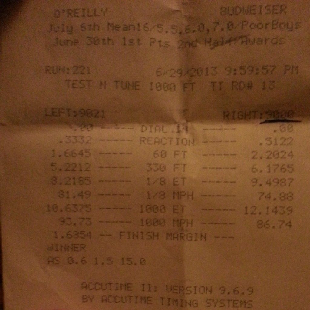 Englishtown raceway park 60' - 2.327 1/4 - 15.354 Mph - 91 I weigh around 280lbs I will be going to island dragway tonight and hopefully better my time. I will update you all if I do. |