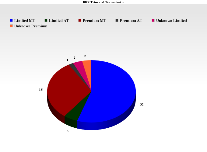 -Map has been updated to reflect current members.(thanks to MannyO) -Member's list updated (59 Members in total) -Google document of Data is in progress Summary: WRB and Limited Manual Dominates the numbers Graphs: AS of 9:10 Pm EST today 3/1/2012 Graphs will be updated every 3 hours on Pre order day today. Otherwise It will be updated weekly. BRZ Colors(as of 9:10pm Est) ![]() BRZ Pre order Trim and Transmission (as of 9:10pm Est) *Unknown Category added because some people forgot to add their transmission* ![]() Next Update is around midnight.
