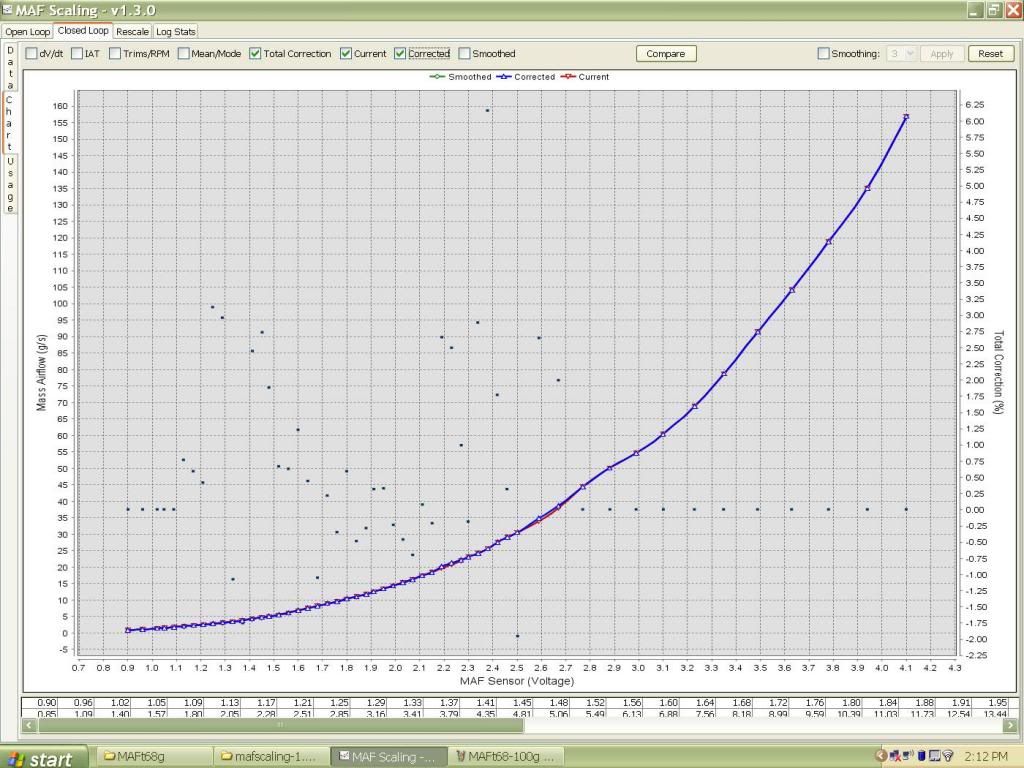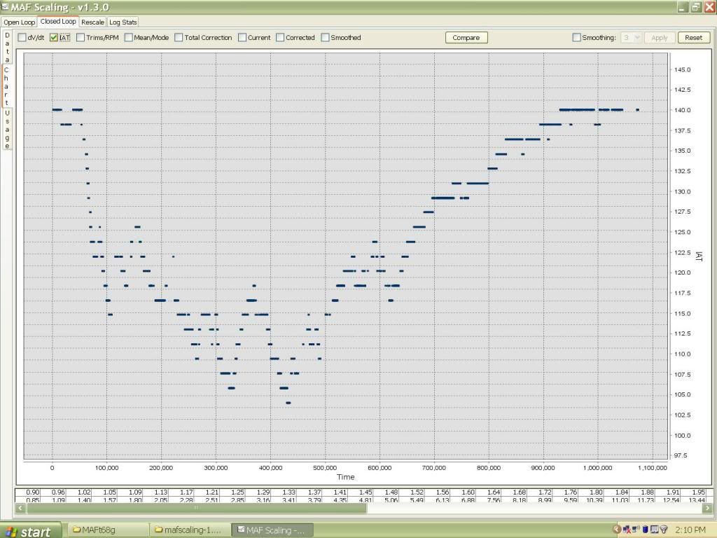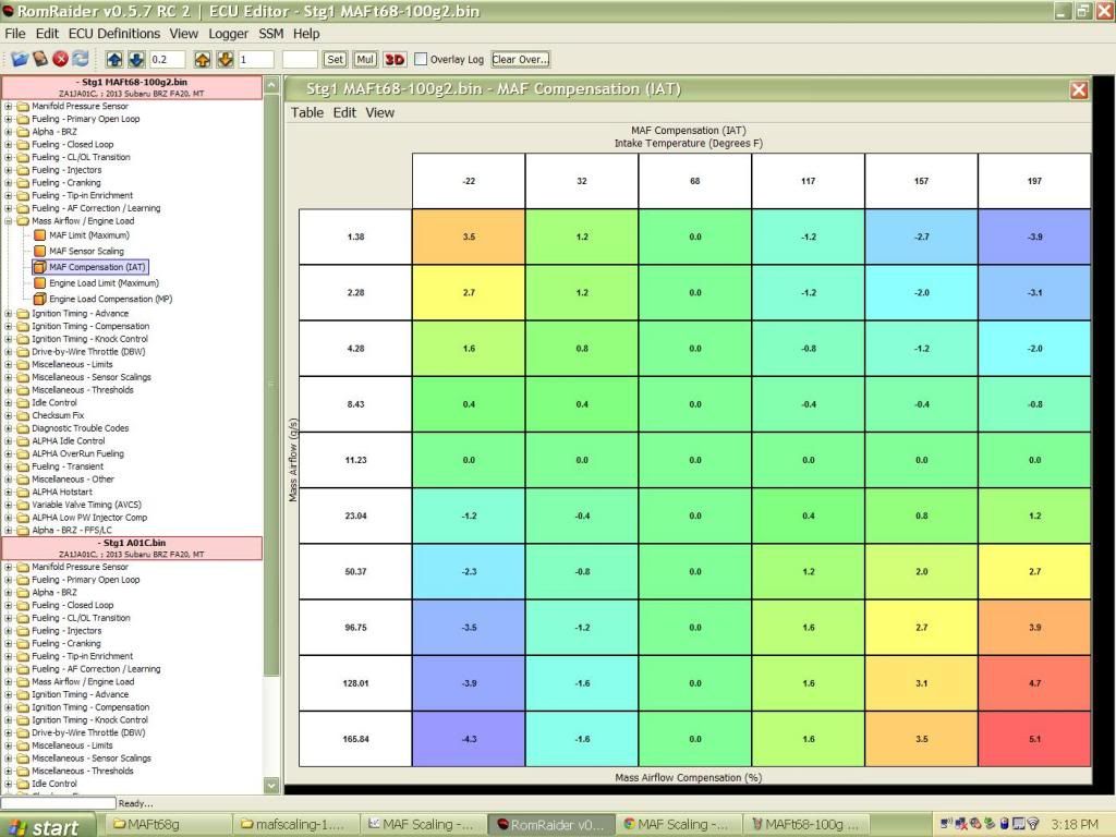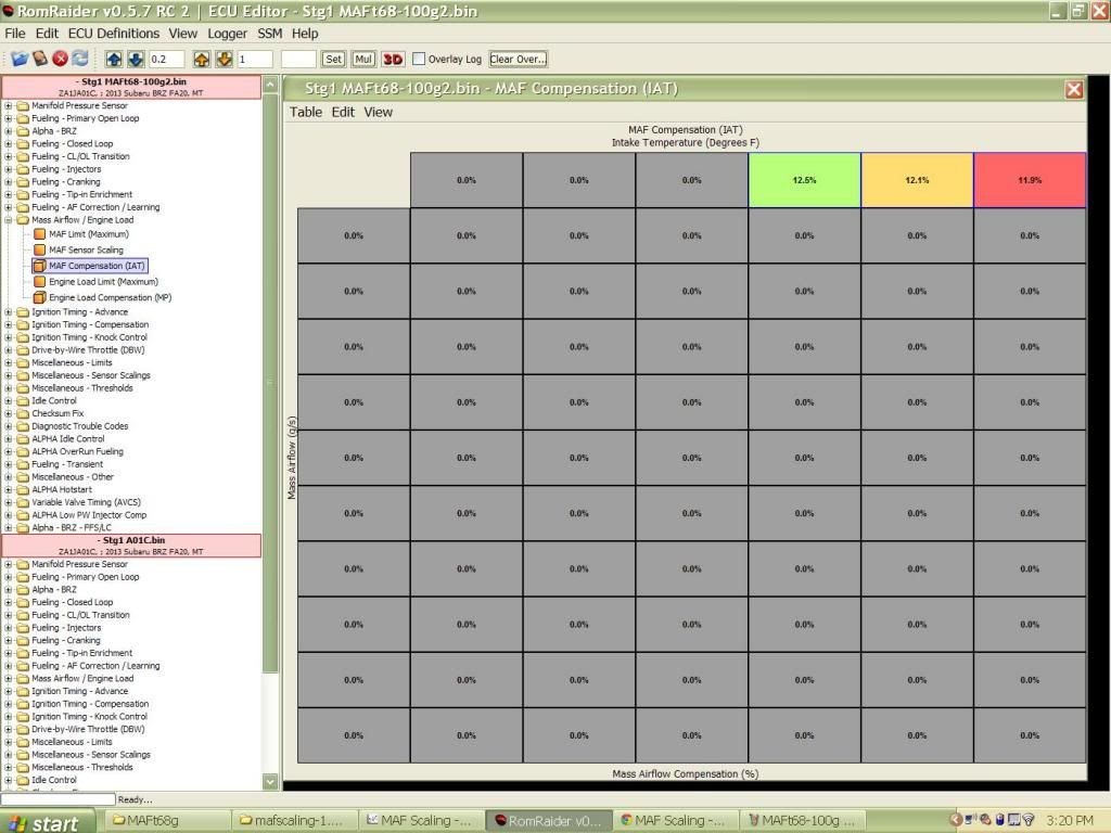 So I've come up with a compromise with the MAF temp compensation. Since I was able to make one for 68F and another for 100F, Ive decided to combine the two. I was able to modify the temp compensation table to work in CL using my 68F MAF scale up to 120F IAT with satisfactory results, but not in OL. In OL it would consistently run leaner in higher IAT while using the 68F MAF scale regardless of what I did to the compensation table. I have now applied the 100F MAF scales values from 2.8 and up to my Temp comp modded 68F scale, so that it does not lean out in higher temps. The down side is that it will run slightly rich in cooler temps. I can deal with that. Will post logs of my results later.