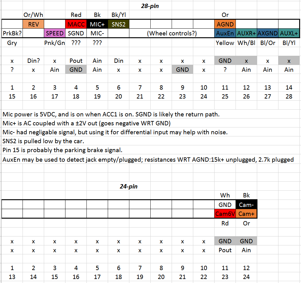 Anyway, I started a spreadsheet (I'm an engineer...), but forums don't like tables, so below is a png of what I've been able to dig up so far. Please let me know if you know what any questioned signals are, or see errors. The perspective is facing into the existing wiring, or looking at the back of the new connectors / away from the radio, which is not quite canonical, but should make it easier to wire up connectors. I got some good feedback via PM, and did some scoping of the mic signals, so the table has been updated. The mic signal on an AVH-X5700BHS appeared to be unamplified condenser signal with a DC bias of ~1.4V, which only came on when the microphone would be used. The audio signal was low, maybe .1Vpp for loud noises. Last edited by tk1138; 03-01-2016 at 07:17 PM. Reason: Updating the "spreadsheet". |