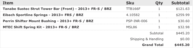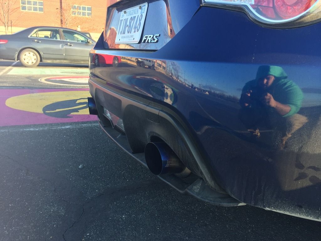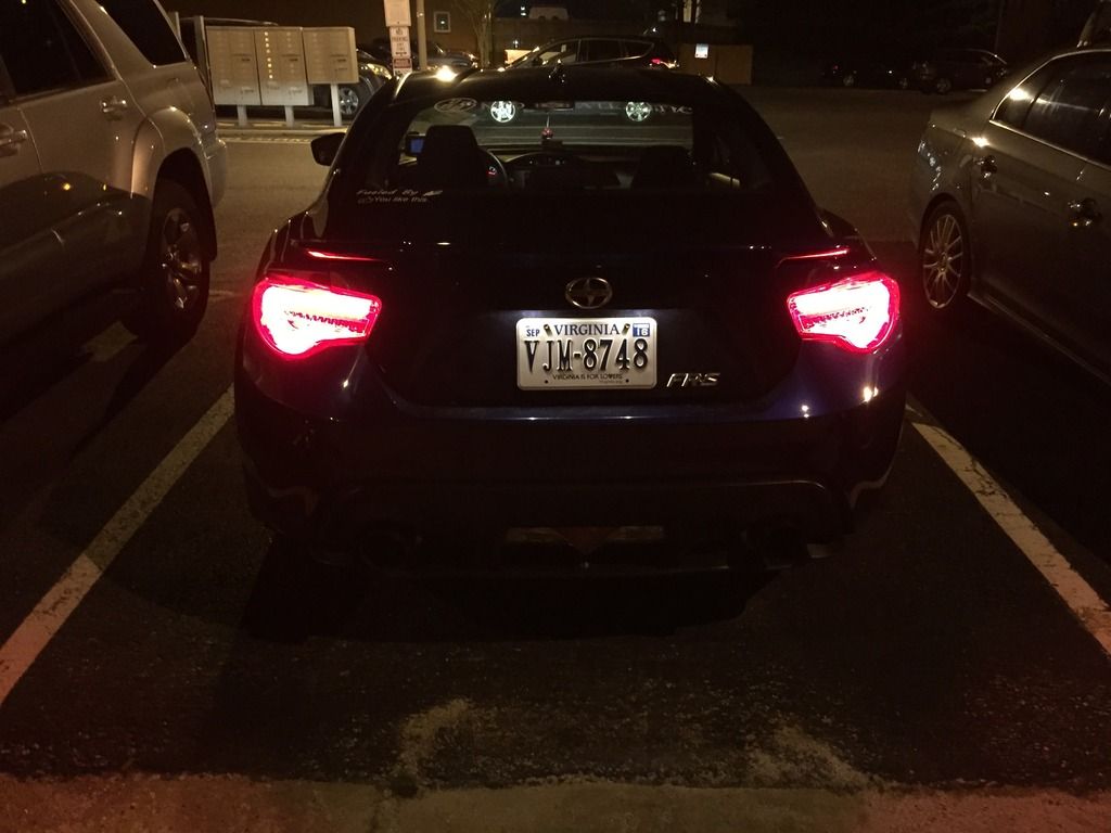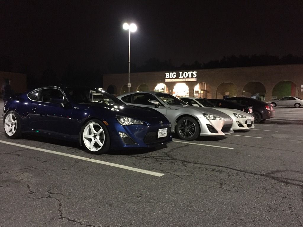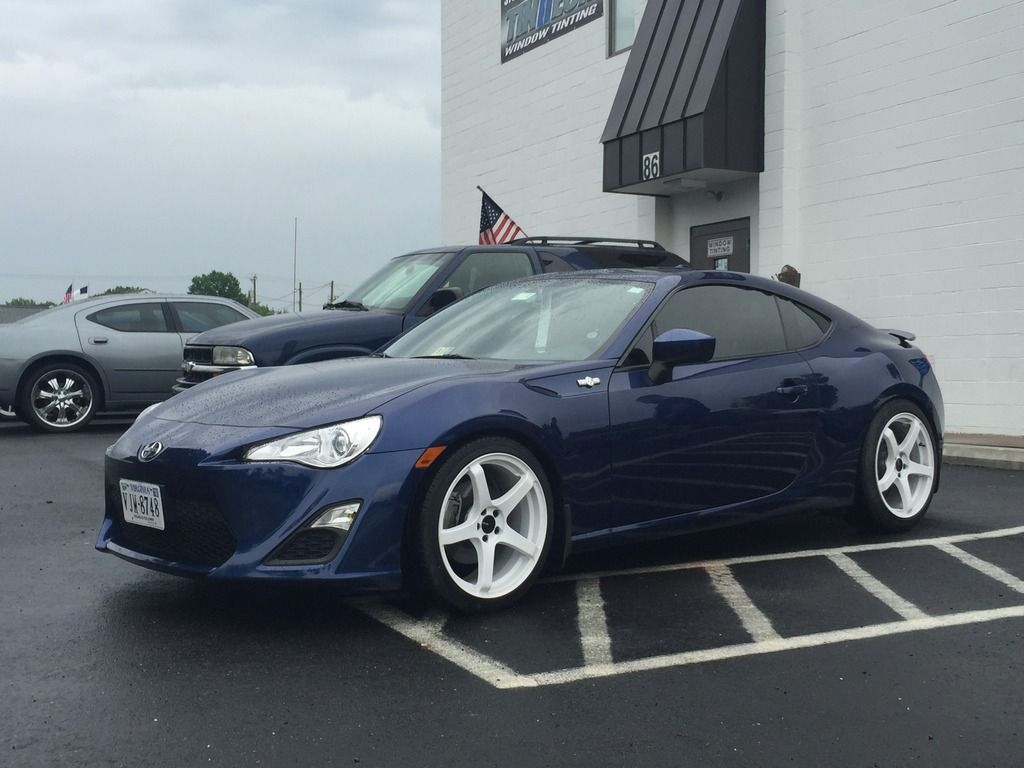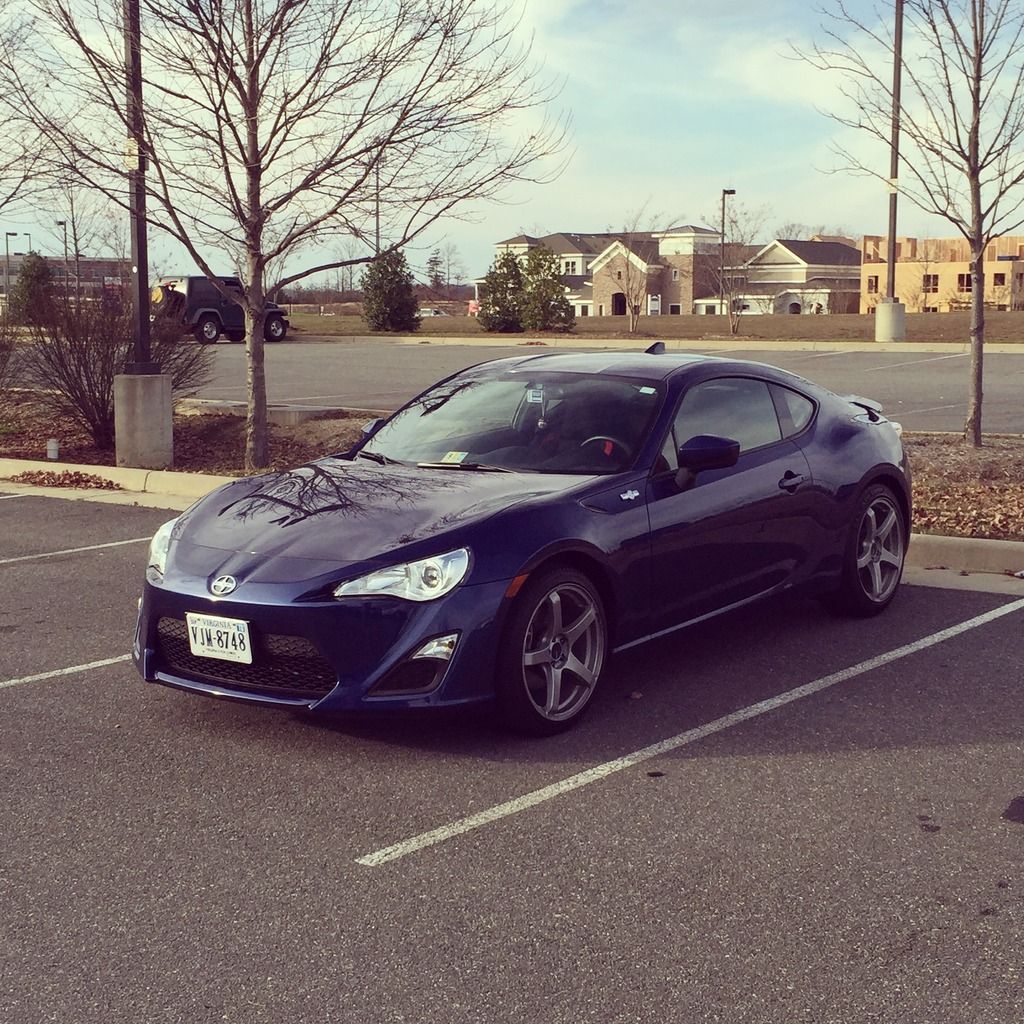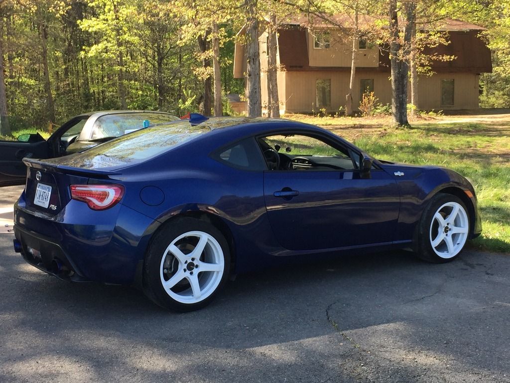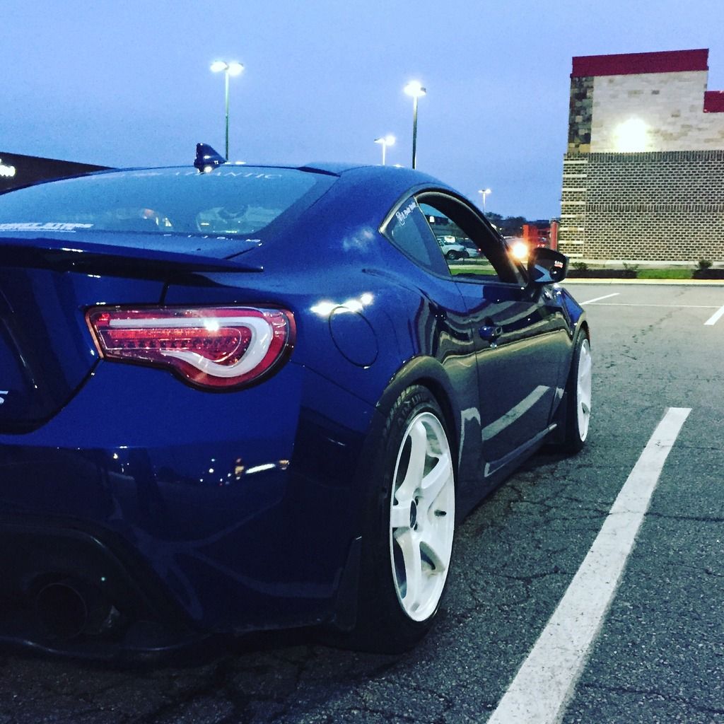 A little background: I've been a car guy all my life, but my experience is with European cars. My previous vehicle was a 2008 Volkswagen GTI, that I sunk every bit of $20,000 into. It was stage 3, with a custom PTE5858 big turbo setup, with water/meth injection, E85, a Peloquin LSD, a fully built suspension, and all the supporting bits and mods. It made around 450whp, so I'm no stranger to wrenching on a car, and eventually, I plan to get my FRS to around 375whp via forced induction or LSx swap. Back in September of 2015, I picked up a 2015 Ultramarine FRS. 8 Miles on it, factory options included the Glasscote protection, (I have a wife and baby, so this was a must), and I upgraded to the Navigation radio as well. Baby's first bath: ![]() Right away, I got tired of the lack of traction with the stock Prius wheel and tire setup. Got a screaming deal on a set of Enkei Kojins in 18x9, wrapped in a set of 225/40s in the front, and 225/45s in the rear. ![]() Next it was time for more power. Pulled the trigger on a group purchase for a set of 1320's UEL headers and 62mm overpipe. ![]() Fitment of the headers to the block was pretty good. I was shorted a set of hardware, so I had to go to Home Depot and purchase two bolts, four washers, and two lock washers to mate the overpipe to the headers. From the first start up, the flex pipes leaked. A little disappointed in that, but several months later, I still haven't been bothered enough by it to fix it. At this point, I saw a fellow FRS owner with an eBay rear diffuser, and decided to have one for myself. I want to say it was like $80, and the fitment is spot on. The instructions are garbage, but anyone with any experience with trim pieces could figure it out with no issues. I didn't drill any holes for mine, and I've had zero issues with sag or it being too loose. I also added OEM Toyota mudflaps to help with the debris coming from the wider tires. Good mod, but I'll be switching to the RallyArmor mudflaps soon. (See exhaust picture below for these mods installed on the car.) Next came an OFT. I flashed the stage 2 UEL tune, and it really woke the car up. But I wanted more. I located the nearest gas station with E85, which was almost 45 miles from me, but decided to give it a shot. I ran a FlexFuel kit and E85 on my GTI previous to this, and the results were impressive, so I was keen to see how it would perform on a naturally aspirated car. I used OFT's pre-loaded E85/UEL tune, and was pretty happy with the results. The car now had a solid amount of mid-range power, and the torque dip was GREATLY reduced. I was really annoyed with how much the stock catback muffled the UELs, and like everyone else with this car, I was after the boxer rumble. That came courtesy of an Invidia N1 resonated catback. ![]() (FAQ: Yes, it's loud. Yes, it drones. No, I haven't received any tickets.) ![]() ![]() ![]() I was VERY happy with the exhaust, and the butt dyno showed a little more torque, with maybe some high end power gains. Certainly minimal, but definitely felt a little better. Next, I added a drop in K&N filter. I debated this mod more than any other modification that I've done to this car. I did extensive research, and it seems like the general opinion is split pretty evenly down the middle, as to whether it's worth it or not. In my opinion, I think it's worth it. I definitely heard a little more induction noise, and throttle response felt improved to me. Again, no numbers to back it up, but the butt dyno felt an ever-so-slight change. My only recommendation with this filter is to get off all of the excess oil BEFORE you install it. While attempting to put spacers on the rear wheels to get my fitment and HELLAFLUSH sorted out, I stripped out one of the rear wheel studs, so I pulled the trigger on a set of ARP's extended wheels studs. ![]() Next, I picked up a set of authentic, clear Valenti tails from a local who was selling at a good price. (Please pardon the crappy iPhone pictures) Halfway through: ![]() Completed: ![]() Install was super easy, maybe 15 minutes. Still one of my favorite mods to this day. While backing into a parking spot at night, I BARELY touched the curb with my passenger side rear wheel. So, it was time to refinish the wheels. Sanded the curbage out, and body filled the damaged area. For shits and giggles, I decided to paint them white. I like it. Nobody else in my area has white wheels on an Ultramarine FRS, and I can't find too many people with it on Google either. Maybe because people don't like the way it looks, but oh well. :thumbs: ![]() Picked up a Kartboy shifter from another local here, and installed it promptly. Install was easy enough. FT86Speedfactory has a great video on YouTube that makes it almost fool-proof. I was impressed with the feel of the shorter throws. I couldn't really notice a difference just running through the gears while parked, but as soon as I got on the road, the difference was huge. My only complaint was that it felt sloppy. There was WAY too much play in the actual shifter, both in neutral and in gear, so it was time for a Perrin rear shift bushing and MTEC shift springs. Made an order from @ft86speedfactory: ![]() Very happy with the whole experience. Received the Eibach springs and the bushing 2 days after placing the order, and the MTEC springs a day after that. The strut bar should arrive tomorrow. I installed the springs first. I chose the Eibach kit for several reasons. I had experience with Eibach in the past, and their customer service has always impressed me. That in and of itself is reason for me to spend a few extra dollars. But I also liked that the Sportline Kit included new bumps tops and dust covers. Modifying the OEM ones was not ideal to me. The install was very straightforward. If you've ever done any suspension work before, this will be a piece of cake. Whole thing took less than two hours, and I did it by myself. I did not use the new dust covers, as my car is still relatively new, a