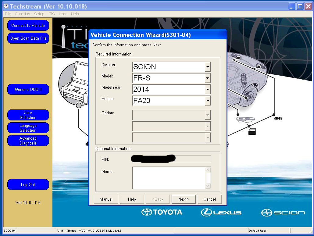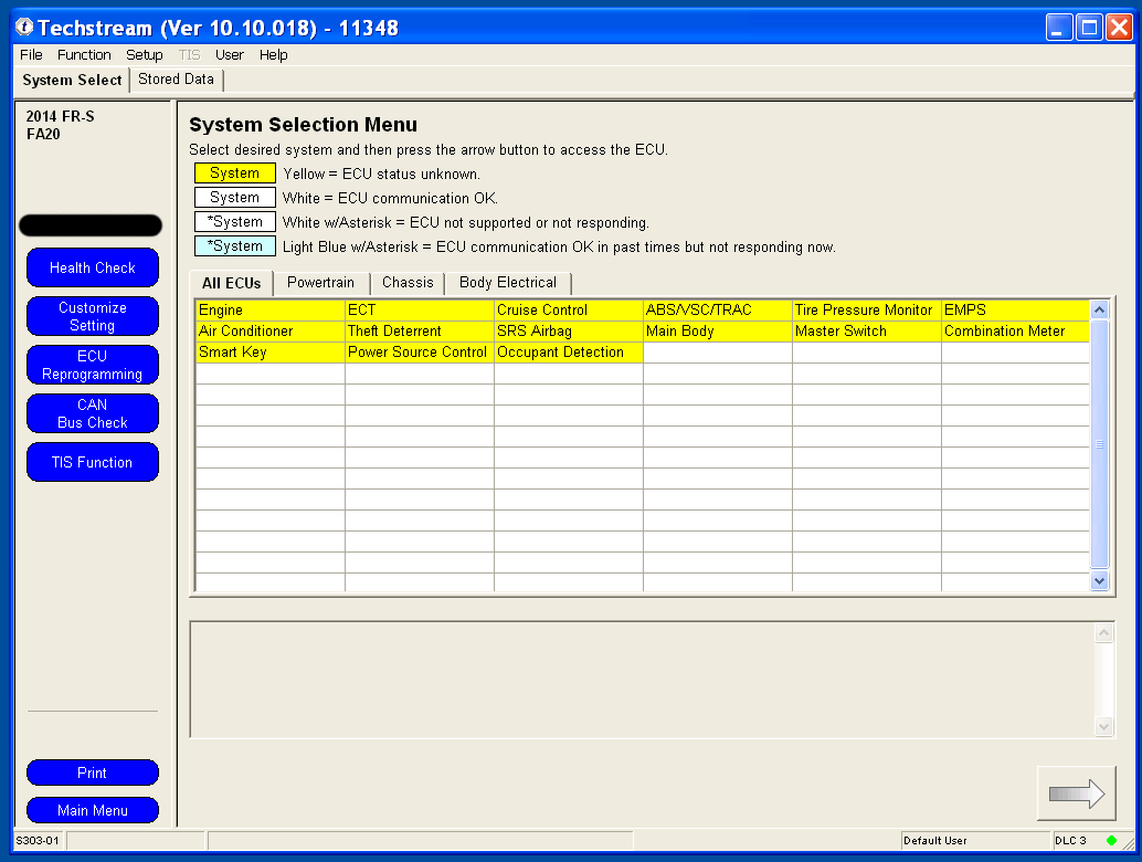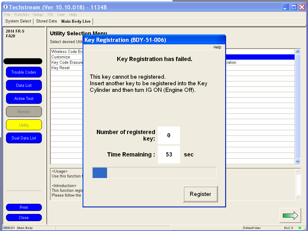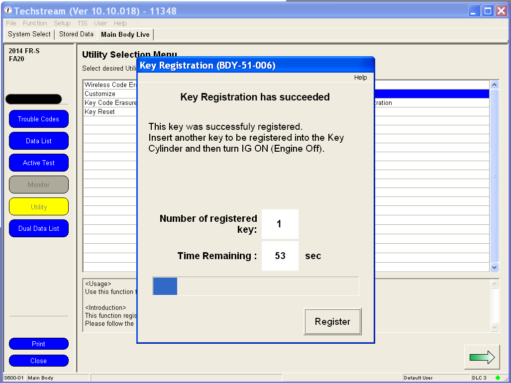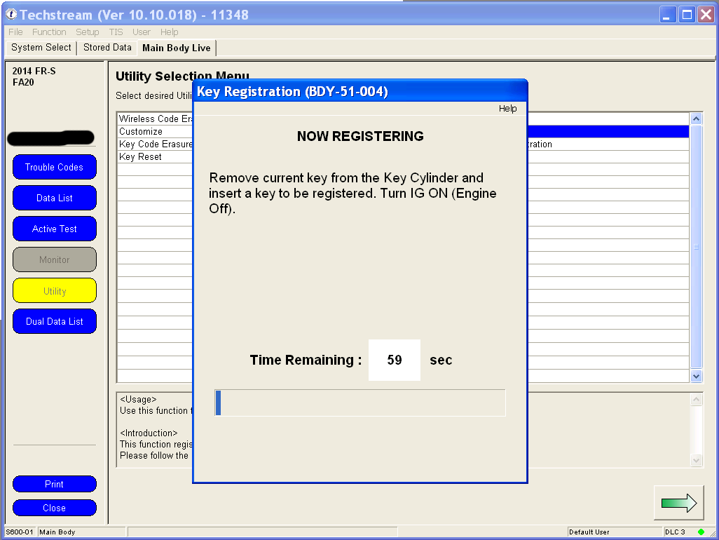 Yes there is an alternative to the expensive OEM clicker key! This guide will help you put together a replacement clicker key for about $80, which is the lowest cost possible solution from all of my research. If making multiple keys, one could save a substantial amount. (Alternatively you can just use parts of this guide to program an OEM clicker key, which costs about $165. At least you're saving on programming costs.) This guide assumes that you have at least ONE remaining programmed key. This is the only method to get a generic HYQ12BBY replacement key to work on the FR-S. Although our car shares a FCC ID with other Toyota's, it uses a Subaru immobilizer system, so it cannot use the immobilizer chip inside the generic replacement keys, which was designed for a Toyota immobilizer system. Please proceed at your own risk. I am making this guide to try to help fellow community members. This process can damage your car's computers or your personal computer, cause personal injury, cause financial loss, and possibly waste a lot of time. Parts required: 1. Computer running Windows XP 32-bit, or XP Mode under Windows 7 2. Techstream software 3. M-VCI cable 4. Generic non-chip key that's cut ($2) 5. Genuine Scion valet key, Toyota PN: SU003-01453. The cheapest option is Camelback Toyota at $63.67, with free shipping for orders over $150. I ordered multiple keys. 6. Generic clicker key with FCC ID: HYQ12BBY ($14) 7. Any existing programmed key 8. Sharp razor knife 9. Beverage of your choice. Steps: 1. Set up XP mode under a PC running Windows 7, if you are not running in XP 32-bit natively. Install the MVCI drivers that came with your cable, and install Techstream software. I will post links as I find them, but a quick search will produce many in depth guides. 2. Plug the M-VCI cable into your car's OBD2 port and into the USB port on the computer. Attach the M-VCI cable by clicking on USB at the top of the screen and the appropriate device. The biggest problem I've noticed with devices not attaching on new computers running XP mode is the fact that there isn't a driver for an Intel USB 3.0 controller for Windows XP. You can solve this problem temporarily by going into the BIOS, and under USB settings there should be an option to set the XHCI Pre-Boot mode to Disabled. This forces the USB 3.0 controller to run under USB 2.0 mode. 3. Make sure that you switch your ignition to ON with your programmed key, but don't start the car. 4. Once you start up Techstream, click on Connect to Vehicle. I have version 10, and the menus may slightly differ from other versions. If the connection is successful, you should see the vehicle detected. If the Division says Toyota and other fields are blank, try closing Techstream, cycling the key, and restarting Techstream. Click Next to proceed. 5. Under the System Select tab, double click on Main Body. 6. Under the Main Body tab, click on Utility. 7. If you are afraid that someone who finds your lost keys can open your car, then you may want to use the Key Code Erasure utility first. I have never used this utility, but if you search on youtube there are plenty of tutorials. Under the Utility screen, double click on Key Registration to continue. 8. Have your generic non-chip cut key and your new uncut immobilizer key ready. Under key registration, click on Next to proceed. 9. If this is your first time programming additional keys, you should see 3 keys registered and room for 3 more keys. Click next to continue. Your programmed key should still be in the ignition cylinder switched to ON. You will have 60 seconds to complete each step. 10. Now you have 60 seconds to remove your programmed key from the ignition switch, and insert the new key. Insert the cut non-chip key into the ignition switch while holding the immobilizer key against it, so that the ECU will think that you are inserting a cut immobilizer key. Turn the keys to ON but don't start the engine. 11. The programming should take 1-2 seconds. If successful, you should see the following message immediately. I forgot to take a screenshot, but from my memory I recreated the message that you should see. If you have further keys to program, take both keys out of the cylinder, and insert the generic non-chip cut key along with a new non-programmed immobilizer key held next to it back into the ignition cylinder. Turn to Ignition on but don't start the car. Programming should take 1-2 seconds. Again, you have 60 seconds to complete this process. If you have no further keys to program, just let the timer expire. If you accidentally insert a programmed key back in, you should see the following error message, with another 60 seconds to insert the correct key. 12. Once complete, you should see the following message. I only programmed one key in additional to the 3 that came with the car, so I have 2 spaces left. 13. Start the car by inserting the generic non-chip key, along with the programmed immobilizer chip held next to it. The car should start and idle. Last edited by customfab87; 06-07-2016 at 04:41 PM. |