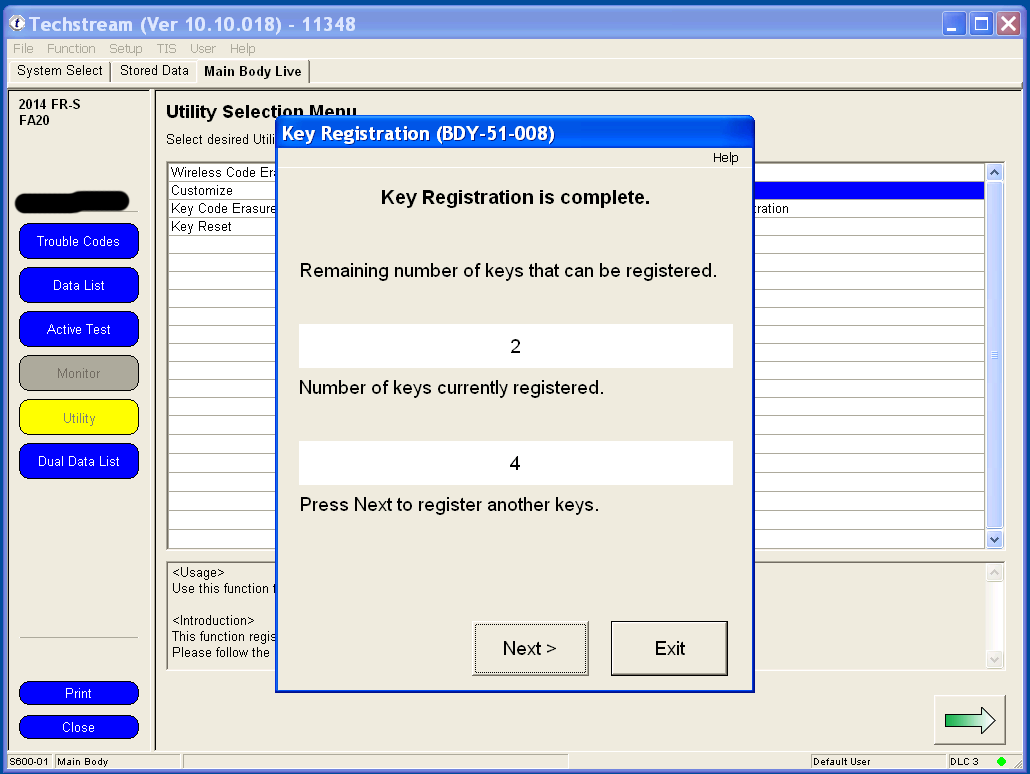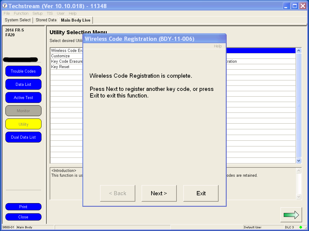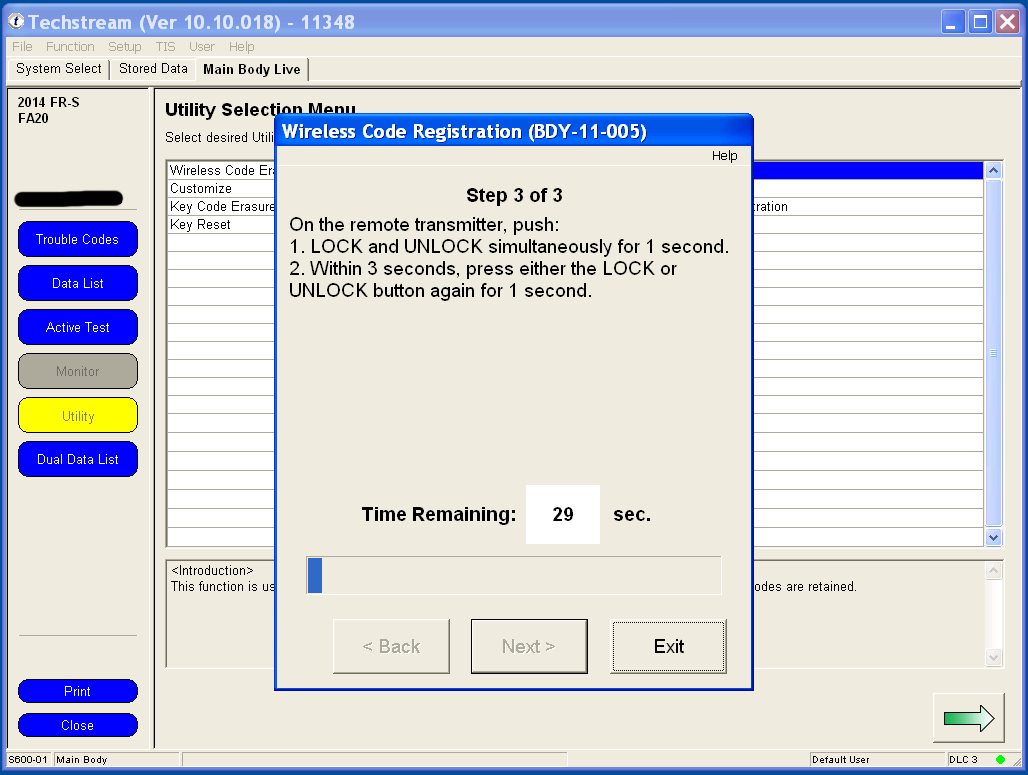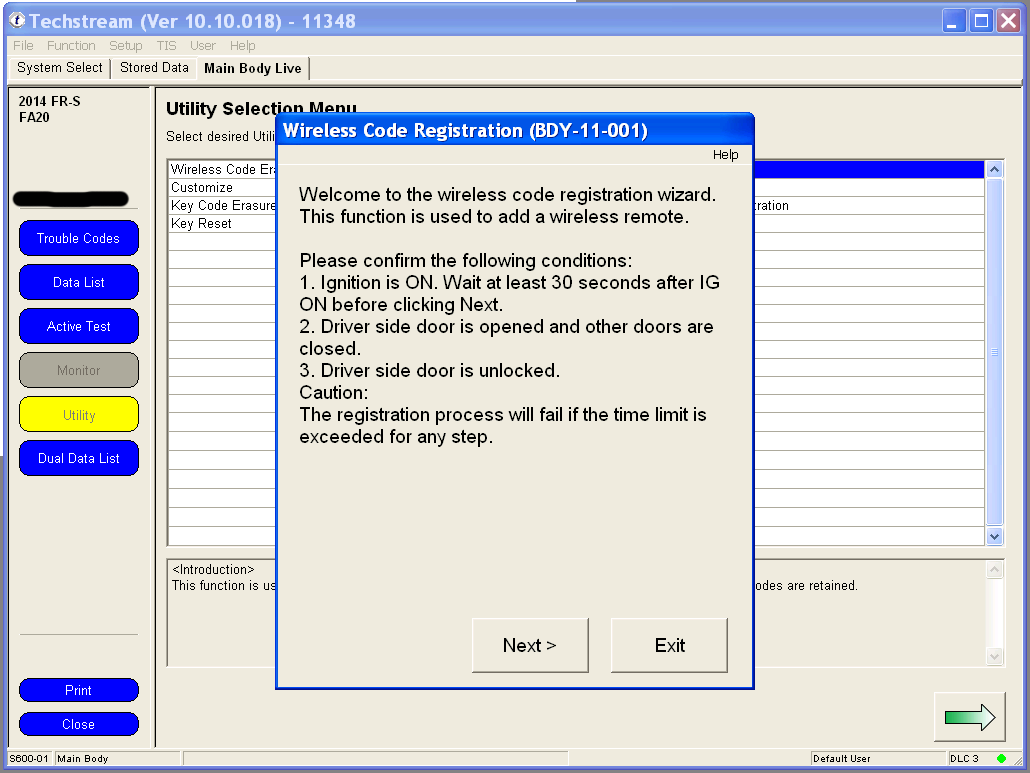 Programming your remote's functions is much simpler under Techstream than the manual method of remote programming, and involves only two clicks of the remote. You can use any generic replacement clicker key with the FCC ID: HYQ12BBY. 1. Under the Utility menu, select Wireless Code Registration. Utilty.png 2. If your key is not already in the Ignition, switch to Ignition ON but don't start the car. Wait at least 30 seconds before clicking Next. Make sure the driver's door is the only one that's open and that it's unlocked. 3. The body computer can remember 6 remotes. If this is the first time that you are adding an additional remote, you should have space for 4 more, like me. Click Next to continue. 4. You have 30 seconds to complete each step after clicking Next to continue. 5. Using a new unprogrammed remote, hold both the LOCK and UNLOCK buttons for at least one second. Then press either the LOCK or UNLOCK button once for one second. 6. The body computer will communicate to Techstream that a remote has successfully been programmed. Press Next to program another remote, or click Exit to finish. Last edited by customfab87; 06-07-2016 at 04:33 PM. |