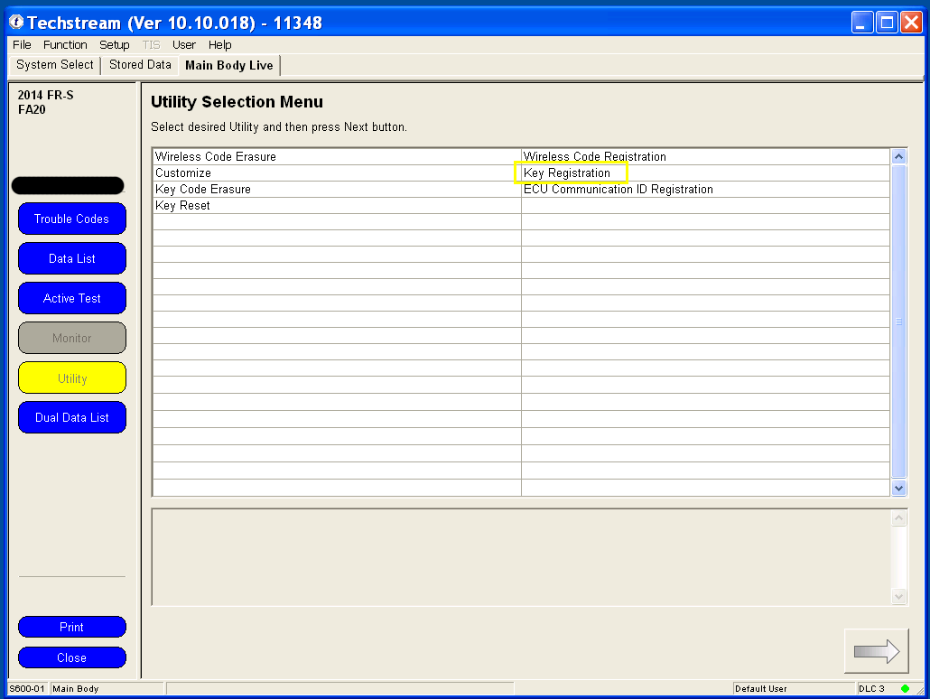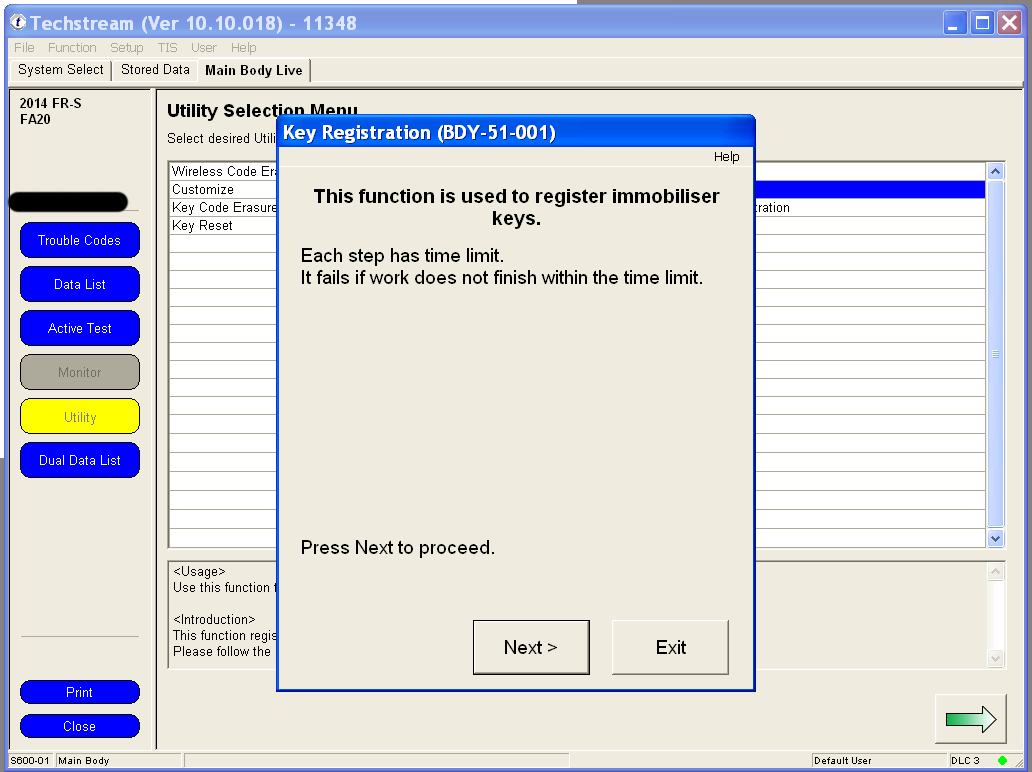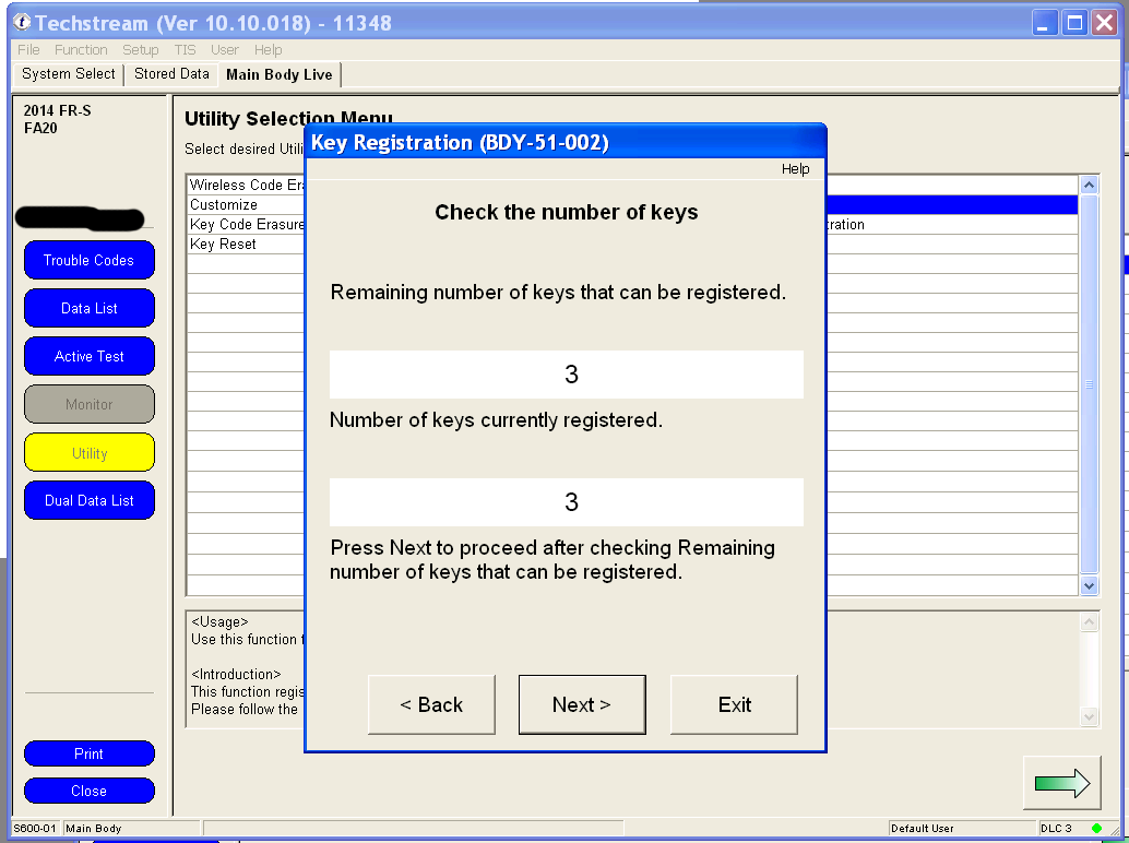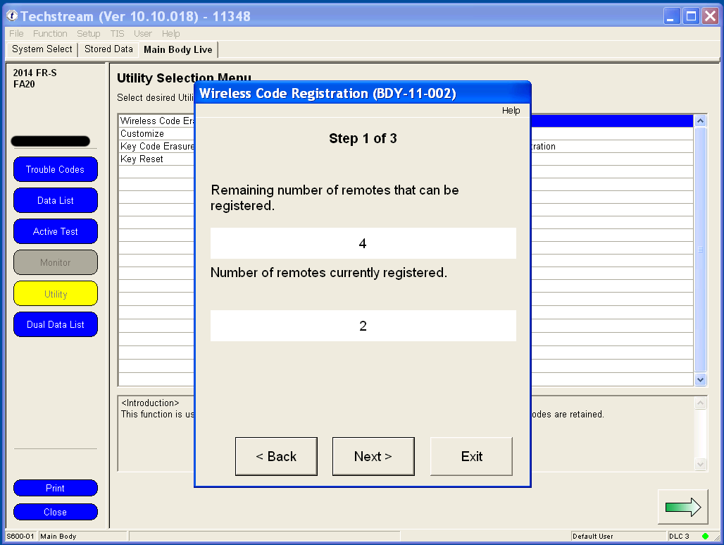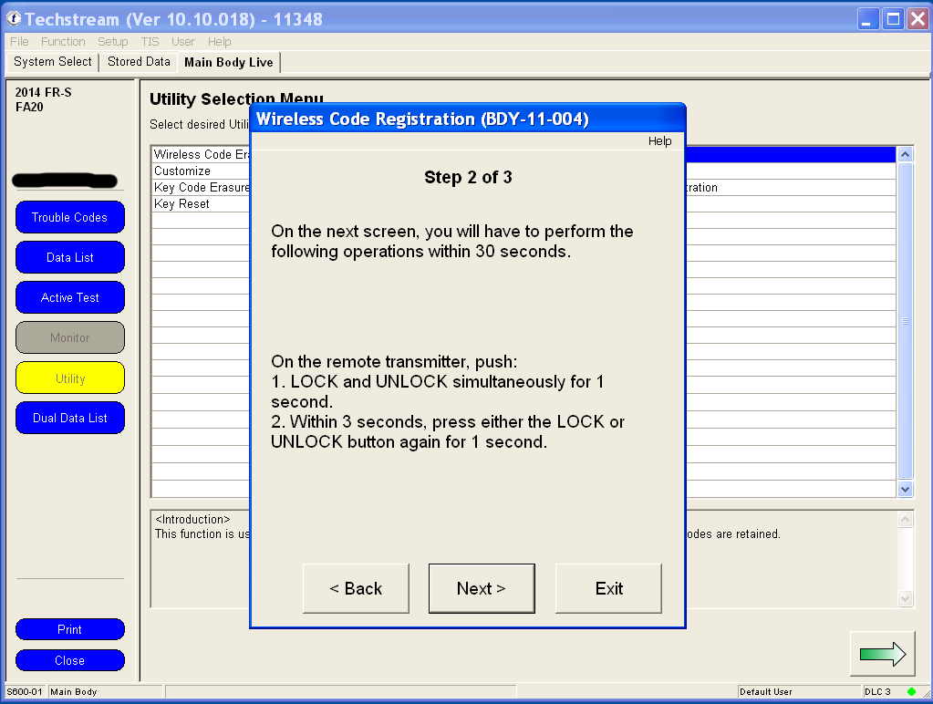 Programming your remote's functions is much simpler under Techstream than the manual method of remote programming, and involves only two clicks of the remote. You can use any generic replacement clicker key with the FCC ID: HYQ12BBY. 1. Under the Utility menu, select Wireless Code Registration. Utilty.png 2. If your key is not already in the Ignition, switch to Ignition ON but don't start the car. Wait at least 30 seconds before clicking Next. Make sure the driver's door is the only one that's open and that it's unlocked. 3. The body computer can remember 6 remotes. If this is the first time that you are adding an additional remote, you should have space for 4 more, like me. Click Next to continue. 4. You have 30 seconds to complete each step after clicking Next to continue. 5. Using a new unprogrammed remote, hold both the LOCK and UNLOCK buttons for at least one second. Then press either the LOCK or UNLOCK button once for one second. 6. The body computer will communicate to Techstream that a remote has successfully been programmed. Press Next to program another remote, or click Exit to finish. Last edited by customfab87; 06-07-2016 at 04:33 PM. |