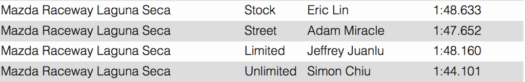 But first I need to provide a bit of background... I've known Andre Hartanto (2015 Bimmer World IMSA Continental Tire SportsCar Challenge Driver) for a number of years. We worked on a few projects together, winning the 2010 Redline Time Attack Super Modified RWD Championship in a NA Honda S2K awhile back. About a year ago, I purchased a Satin White Pearl BRZ Limited, after a long break from motorsports with the goal of participating as a driver and building a fun, easy to maintain track car. My friends at RCREW Racing and Elite Performance have done a lot of suspension work to my car, but kept it NA. In my car's current state it conforms to the Modified Class in the 86Cup at 6.75 points. It turns out that Andre is a regular with SpeedSF, the same group who my friends consistently run with. 1:53.66 is my best lap at Laguna previously. This week with Andre behind the wheel, we also added spring rate (450 lbs front/rear) and added NT01s with great results. Andre broke into the 1:45's even with me sitting passenger adding unneeded ballast. In Turn 2 the Andretti Hairpin, he does the double apex, and in Turns 3, 4, 5, and 6, he gets on throttle before apex maximizing speed. This is something I do myself, but he applies significantly more throttle and is able to maintain control making full use of the tracks width. Braking is done a lot later, at shorter and increased intensity with a well timed downshift to keep the engine in the power band for corner exit. Honestly, for a long period... I thought I had wasted a lot of money modding my car knowing Randy Pobst can run a 1:51 stock, and I couldn't touch that time. But I finally did it... I ran a 1:51.804, after sitting with Andre and gaining confidence in my BRZ. Granted my car is modified with some of the stickiest street tires money can buy, but nevertheless, I'm happy. Bottom line is the car is capable of so much more than what I knew. With him driving we were chasing down fast high hp machines in Group A in the NA BRZ. With more practice in later sessions, I was able to knock my lap time down to 1:49.985. I really wanted to break out of the 1:50's before doing further work to my car, and I did it! Super Happy is how I describe my week. I secretly giggle when I'm alone at home. ![]() ![]() But yea... what a difference... Andre can run a 1:45 in a NA BRZ at Laguna Seca with 5 or 6 laps in the the car. He thinks there's another 2-3 secs left as is... If I weren't sitting passenger, and he were to go "crazy". To put this in perspective, see the current 86Cup records for Laguna Seca below. ![]() Not to take anything away from anyone above, their times are blazing fast. Plus we're all sitting in good company, I'm running an Ecutek tuned by Eric Lin at Elite, and I think Gary's run faster than 1:44 at Laguna in Simon's car, just maybe not at an 86Cup event. These guys are some of the quickest drivers who run with SpeedSF, chasing down GT3s and M3s, and they've been instrumental in getting this car to where it is. Thanks guys! TL;DL Laguna Seca My Previous Best: 1:53.66 Andre Hartanto: 1:45.902 My New Previous Best: 1:49.985