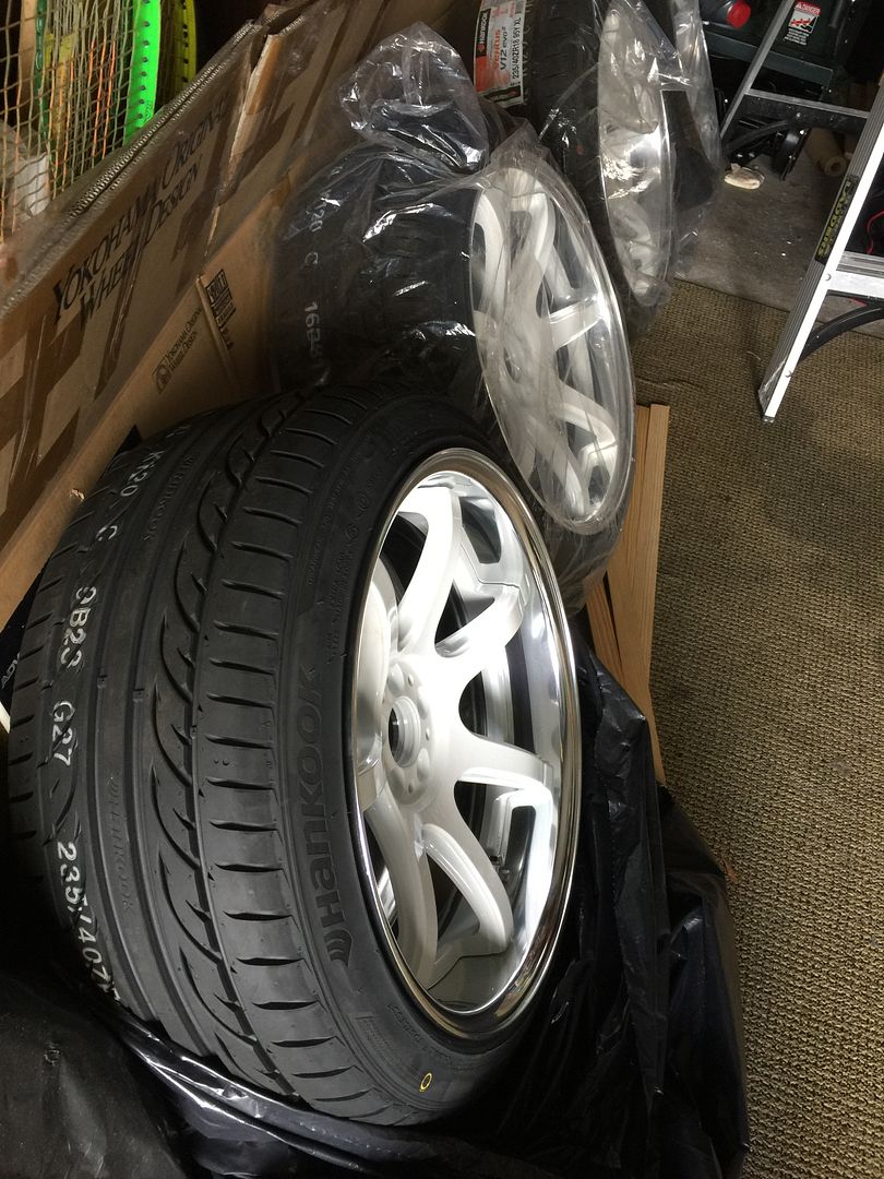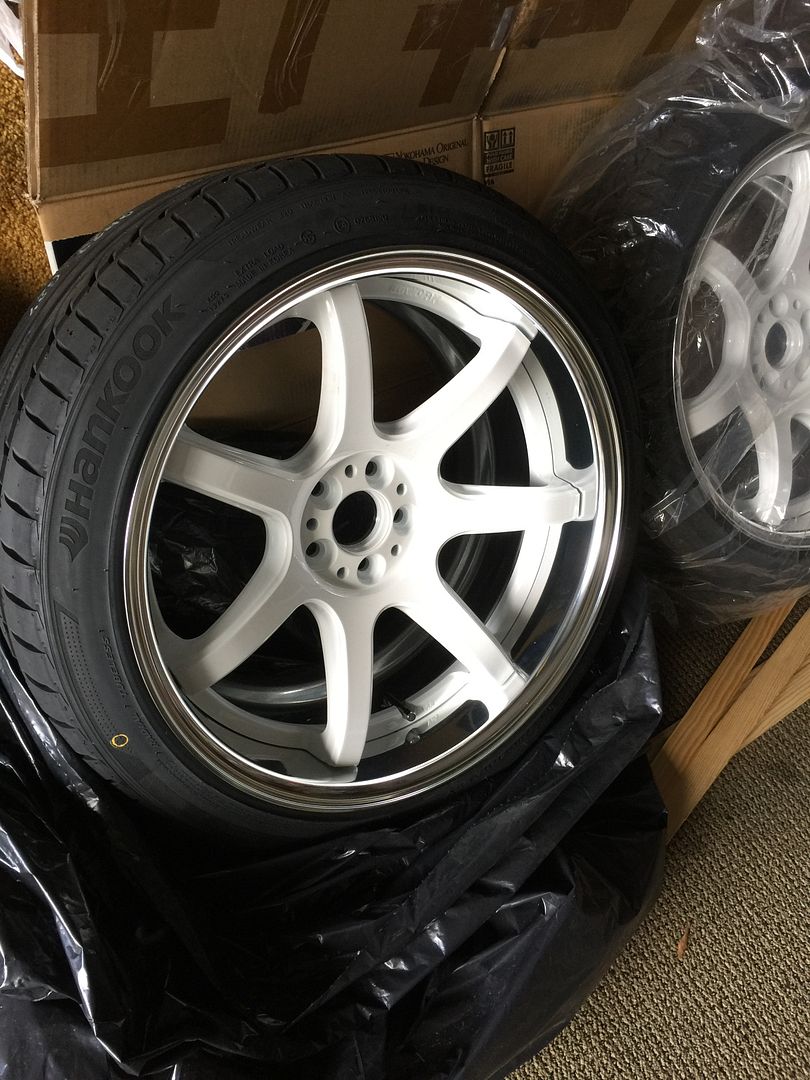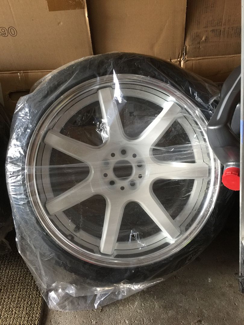 Brand New Work T7R2p in white with a polish lip. Tires are brand new never been driven on or mounted on the car. Waited 3-4 months for these to come it I'm parting out my car and trading in so these have to go. I'm asking $2500 negotiable. Can ship at buyers expense. They come with all work decals for the wheels as well as red center caps. There really isn't anyone that has these on an 86 so you could be unique when purchasing these.