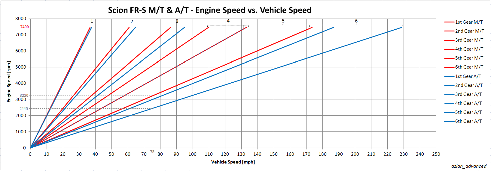 Ouch, no wonder the FR-S Auto is slow. Look at the graph. The auto 4th gear is the same as the MT 5th. They did the Manual perfect for gearing on the FR-S, I really like it.