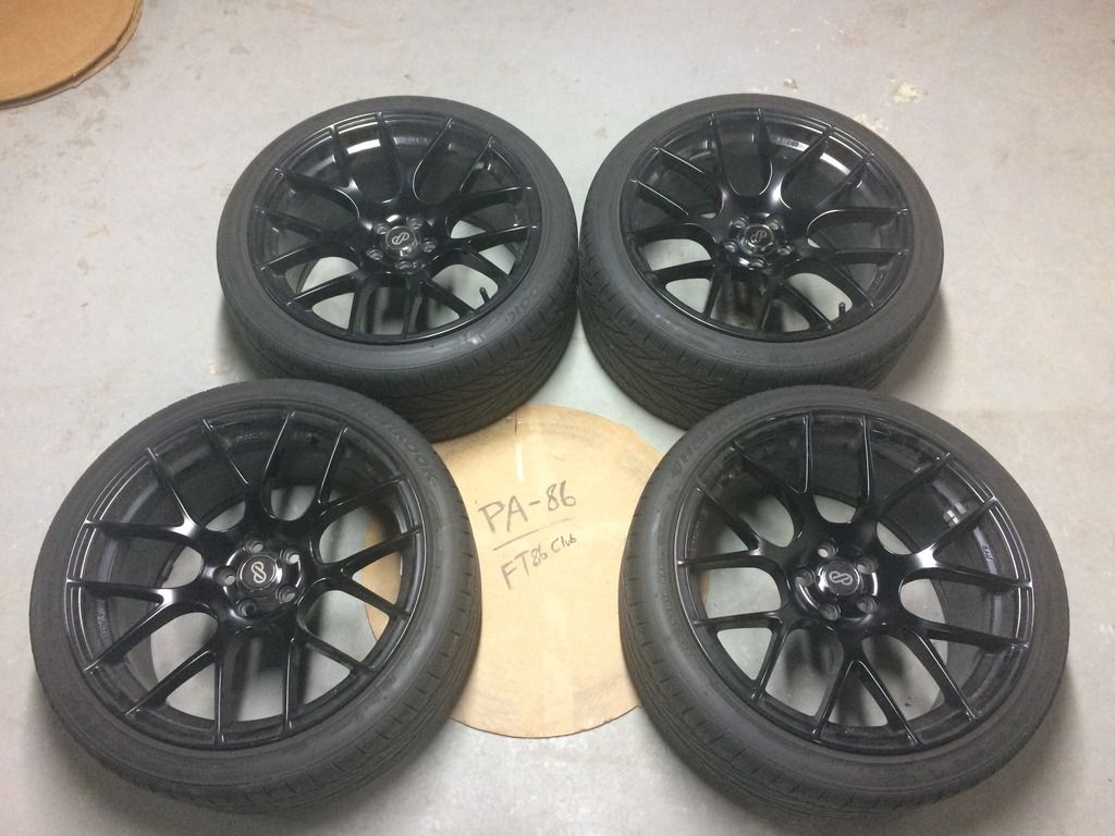 Full set of Enkei Raijin wheels in black 18x9.5 45 Offset with Hankook Ventus Tires 255/35/18. Wheels are in decent shape with no curb rash or major damage, just the normal road wear. Tires are mostly spent, might get a few hundred miles out of them at best. I absolutely loved these wheels, for the size they were very light (only about 2 lbs heavier than the stock wheels and tires) and handled great. Local pickup only (Lancaster Country or Montgomery County). SOLD *Car not included, for reference purpose only