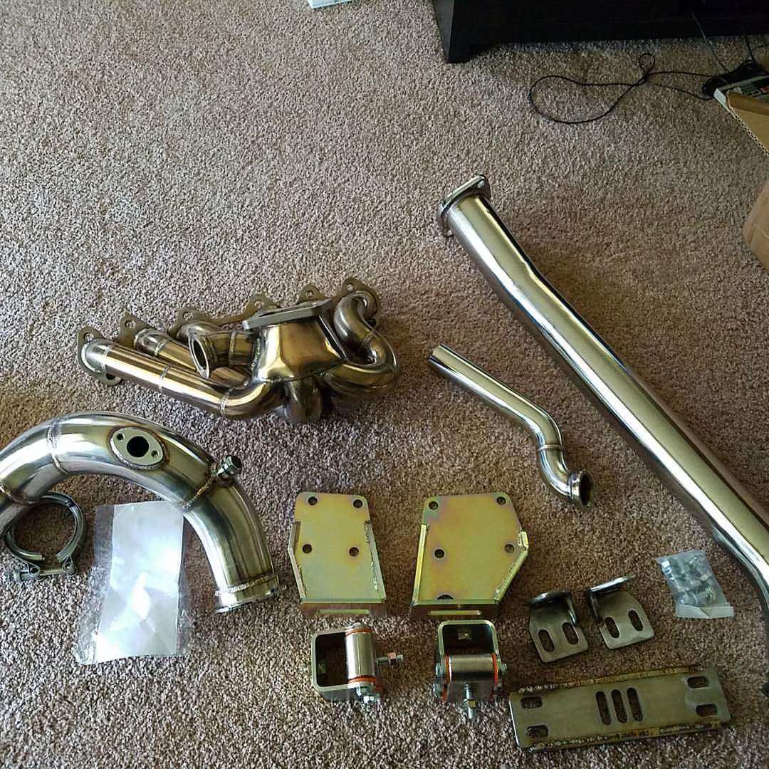 So decided against the 8.8 for some reason. Not sure why, probably to show the naysayers that this diff can hold power. But today was a good day with progress. Installed the new 3.5" t56 to stock diff driveshaft, new intake manifold with Bosch 1600cc injectors, got turbo and downpipe secured, removed stock fuel lines, and mounted/centered the intercooler.