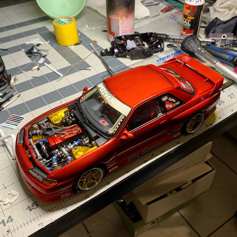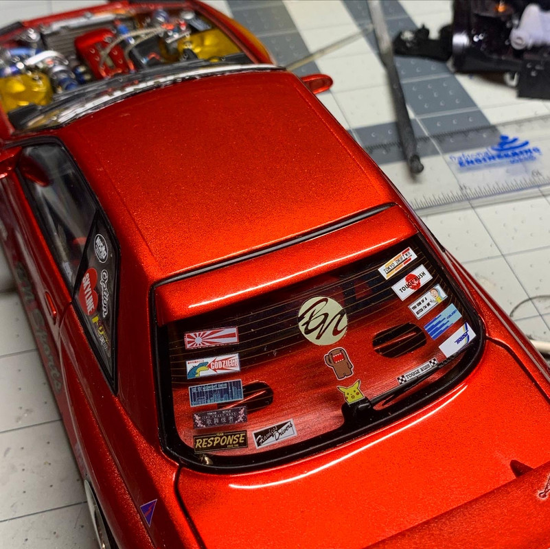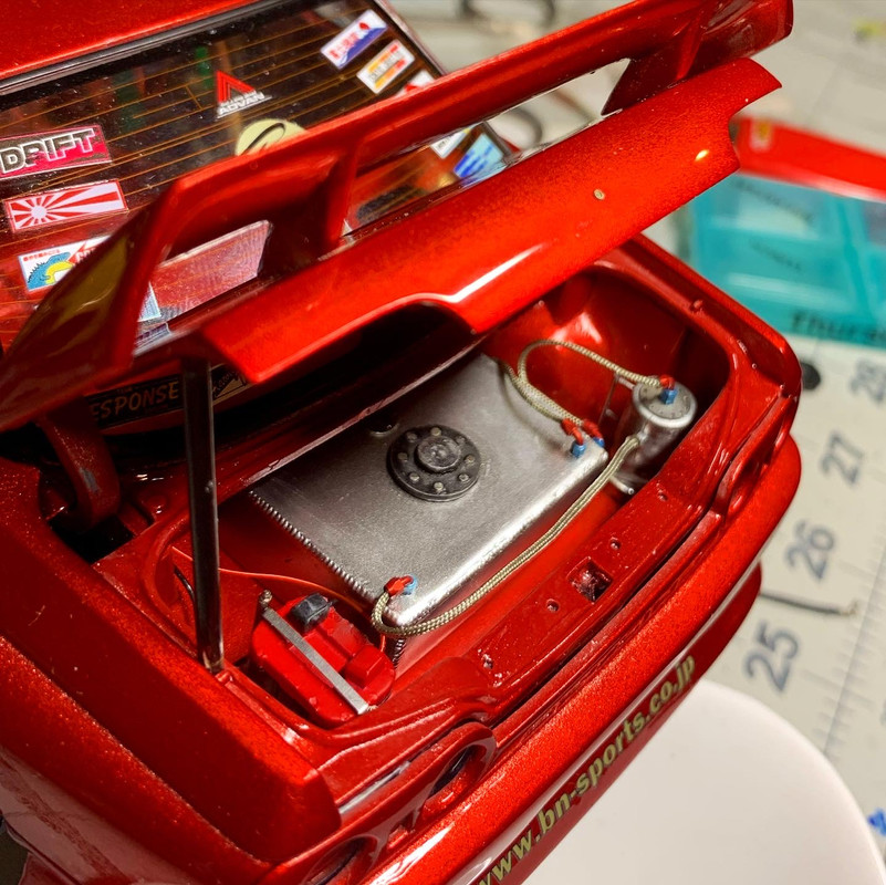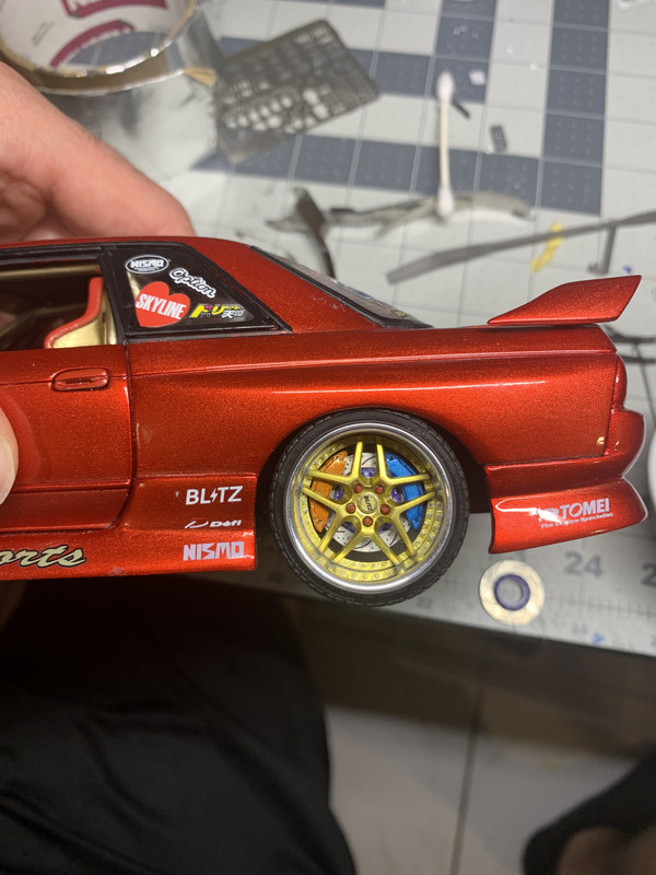 Almost done with this bad boy. It's based on the 1/18 Autoart and I put the BN Sports kit on it and the 326power wing to go with the drift theme. The wheels are Blitz 03 done in gold (Molotow chrome airbrushed and with Alclad gold over it), engine bay is Kandy Gold and body is Kandy Red. Tons of other parts added.