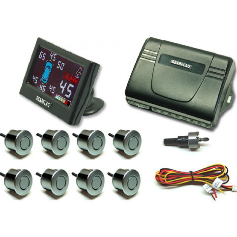 8 sensors system, 4 front / 4 rear, real time numeric display with 2 digit display, audible alarm