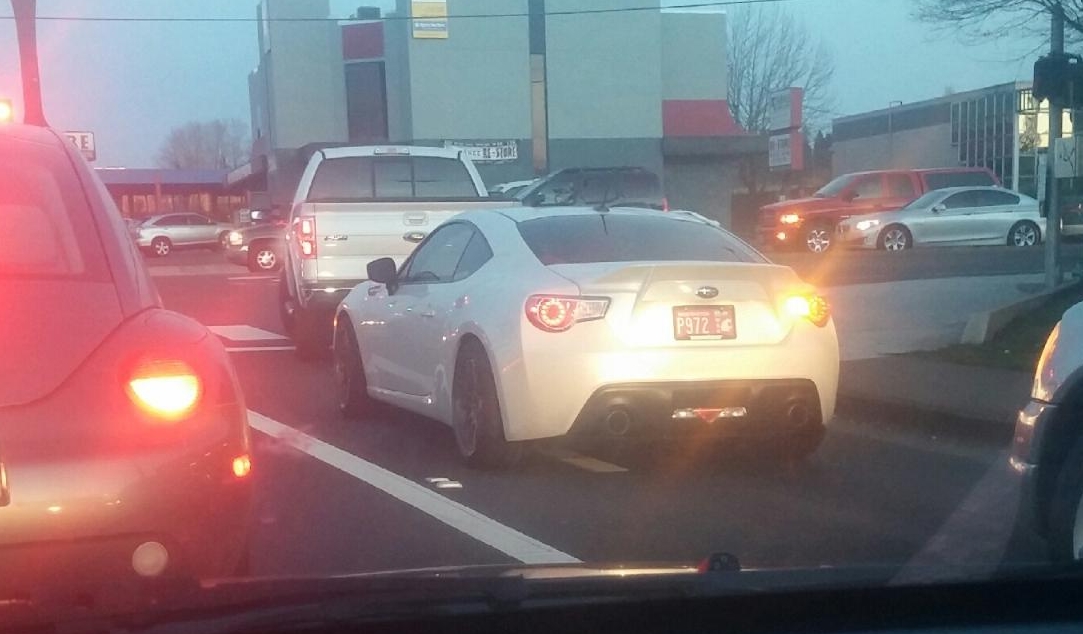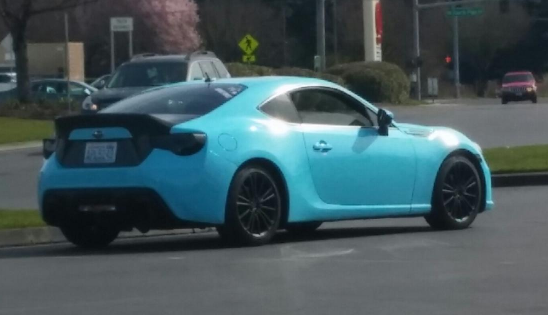 Dark grey metallic brz, lowered, relocation front plate on corner of 121st and fourth plain in vancouver. Girl drives it who works at the coffee place