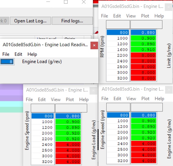 From all I can figure is that I have hit a load limit even though i have both tables set at 8. Injector pulse width climbs till I hit 4 then it never increases even though maf gs are (limited) at 1000 and sd maf is showing 1600g