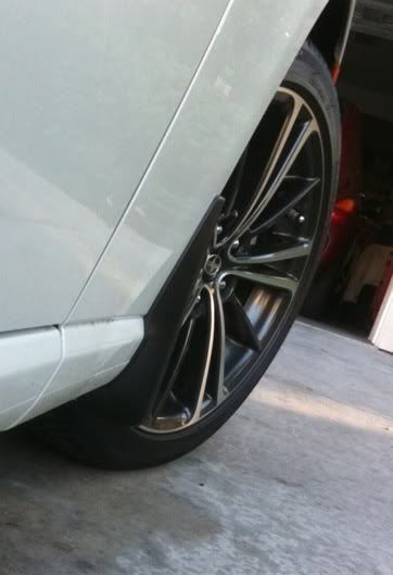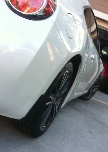 I love my mudguards. They were my first purchase I got for my car. Ordered it off of Amazon for around $50 and installed them myself. I actually think they look great and complete the look of the car (to a point). To me it looks like it matches the rear diffuser and cleans up some of the cars lines. I've always been a fan of mudguards/flaps and not to mention that they are functional too. I think flaps look ugly on this car though. It does require drilling one hole in each rear wheel, but I haven't done that yet and they've been secure this whole time. They flop a little bit if you were to wiggle them.