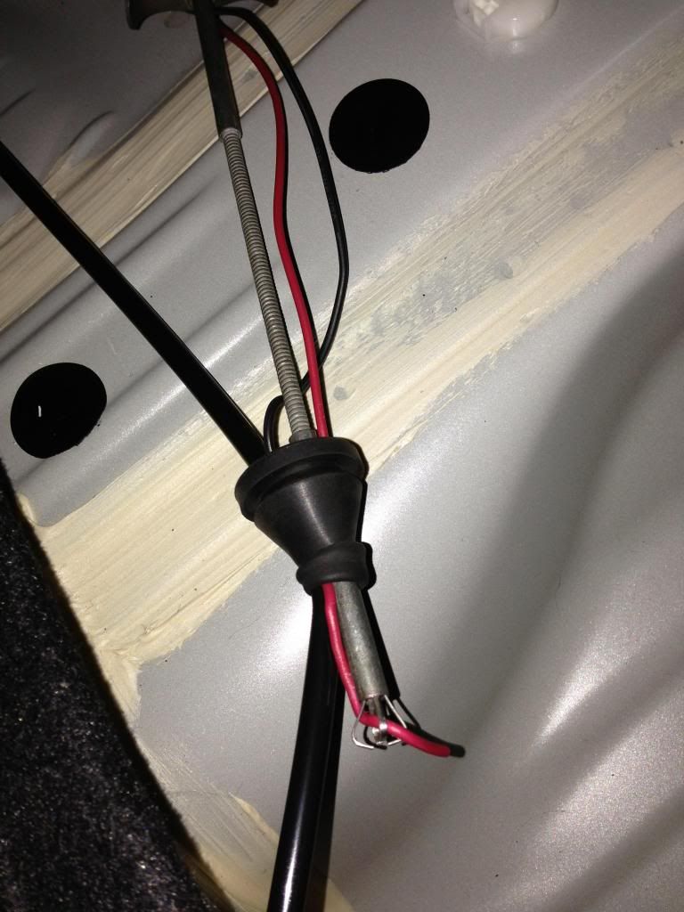 For this kit, all you have to do is run the wires from the bulb harness up into the trunk and tap them into the driver side taillight harness. I chose to route the wires in the same hole as the reverse light harness goes through (I don’t have a pic of this, but all you have to do is trace the harness from the bulbs that are installed on either side of where you had to drill). To get to this, you need to remove the trunk plastic where the latch is. Three plastic clips hold it in place, then you firmly pull straight up on it. (don’t have a pic of this but will get one). Pop the three clips out on the driver side trunk liner (one near the edge of the trunk, and the two by the emergency trunk opener button – you don’t have to remove these two, but it gives you more room to work with. Unclip the harness for the emergency trunk button. Here is the rubber seal I ran the wires through, the same spot the reverse light harness comes through. I used a wire puller to get the wires through. I ran the wires right along the reverse light harness, and zip tied them to it, right up through the hole and through the seal. ![]() Here is a pic of it back in place and taped up so you know where it is in the trunk. ![]() Pull the wires through nice and snug, making sure you have some wiggle room below in case you ever need to pull the bulb out and replace it. Zip tie the wires to the reverse light harness. Step 6 – Tap the wires Unplug the taillight clip. This kit is simple – Red to red, black to black. Use the provided wire taps. ![]() Step 7 – Re-Install the trunk liner clips and plastic trim Self explanatory.. make sure when you put the plastic trim back you line up the clips underneath before pushing down. If you don’t, your going to break them. You also have to pull the rubber seal over the plastic trim once you pop it in place. Step 8 – Your Done! Installed PICS ![]()
