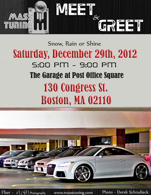 Post your name, what you'll be coming in and the area from which you are leaving and I'll get a list started. ----------------------------------------------------------------------- Floors 4, 5 & 6 (lowest levels) will be reserved, adding up to 700+ spaces. Spectators who prefer not to show their cars can park on floors 1-3. Admission is $12 per car and includes downtown parking until 5am. Expected garage temperature will range from 50-60 degrees. Please keep cars and music turned off when parked. Smoking, burnouts and 2-steps are strictly prohibited. A Boston Police detail officer will be on-site. This event is snow, rain or shine. ![]() 1. JDMenrique/ Enrique/ FR-S/ Buzzards Bay, MA 2. MannyO/ Manny/ BRZ/ Lowell, MA 3. PRORICAN/ Sam/ BRZ/ Buzzards Bay, MA 4. Books/ Cal/ FR-S/ Andover, MA 5. Turbowned/ Corey/ BMW/ Marshfield, MA - I think, BMW or MR2 not sure 6. M-17/ Mark/ Legacy/ Boston, MA 7. Loki2x/ Mike/ WRX/ Watertown, MA 8. Fonzi/ ???/ FR-S/ ???, NH