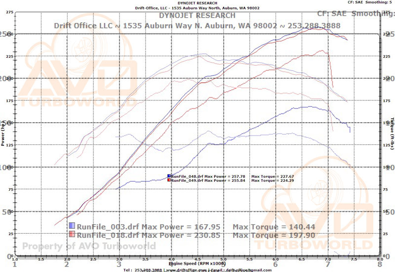 Say I quote a number, then all of a sudden, I'm held to that number. Since this is preliminary, and after I get done with what I deem as final, I might get more power with LESS boost than initially quoted. All of a sudden, someone here is going to "suspect" foul play, even though I've stated that it's under 10PSI. I will hold myself to that number (<10PSI) and we'll see what happens thereafter. Only reason why this is here now (as a peek) is that AVO wanted to demonstrate what a tuned calibration would do for their kit, and we are confident that the end result would make cleaner runs, possibly higher numbers as well. Regards, Bob @ Drift-Office, LLC |