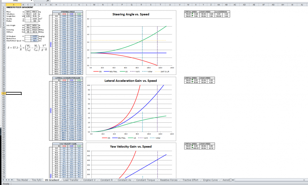 *WARNING: MATH AHEAD* You can approximate the steering angle as: delta = 57.3*L/R + (Wf/Caf - Wr/Car)*V^2/(g*R) this means changing the weight distribution will affect the amount of steer required. Using the stability factor (understeer gradient), you can determine the vehicle's characteristic or critical speed, allowing you to tune its yaw stability as well. k = - (C/W)/((Cf/W)*(Cr/W))*SM*Ay k > 0, vehicle is said to have US k = 0, vehicle is said to have NS k < 0, vehicle is said to have OS Vchar = SQRT(1/k) Vcrit = SQRT(-1/k) delta = steering angle L = wheelbase R = radius of corner W = vehicle weight Wf = weight front Wr = weight rear C = vehicle cornering stiffness Caf = cornering stiffness front Car = cornering stiffness rear V = velocity g = gravity k = US gradient SM = static margin Ay = lateral acceleration It's been a while since my vehicle dynamics class, but that's what I remember and found sifting through RCVD and old lecture notes. I have a crude Excel calculator for basic vehicle dynamics parameters I could send. If you're interested just PM me.