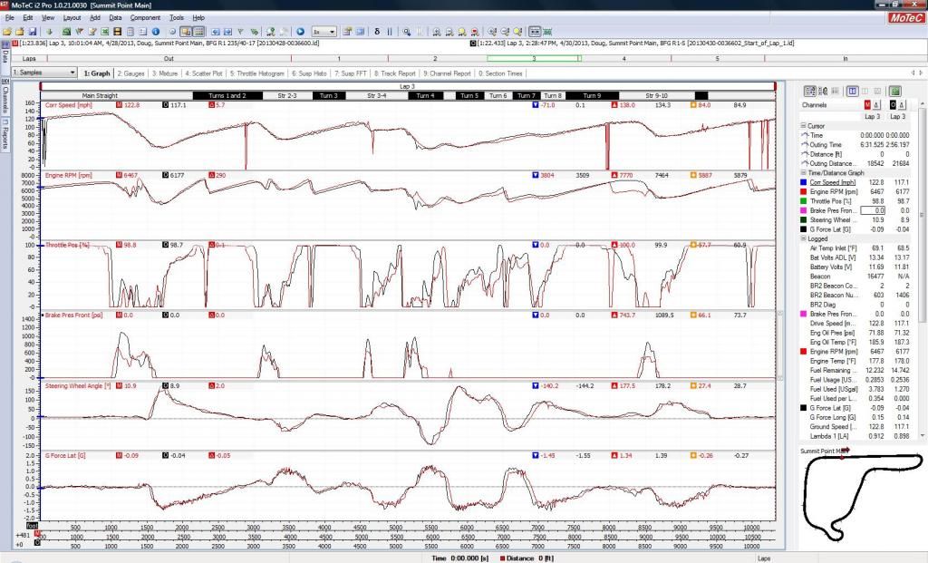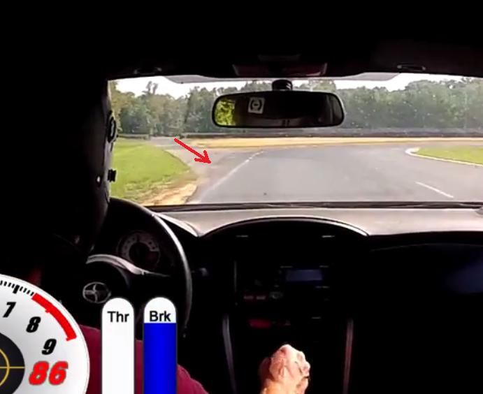 Some thoughts: 0) Your line is very good; I only saw a couple of places where I'd make or consider making a change (see below). 1) Because he's braking earlier, he likely has his car more settled at turn-in. You're frequently a bit abrupt at turn-in. I'd leave the late-braking to others, and concentrate on being as smooth as possible all the way through the corner with the goal being to go flat at the apex and stay flat after it (in the corners where that's possible). You can then play with adding entry speed, which is easier when you've got your major braking out of the way and the car is settled. 2) As was mentioned, he's got way more torque than you do (~200, I would guess), and because his HP is greater than his torque, he's not having to pay a price for that advantage. If you solve that, I suspect you'll no longer be in TTD. 3) You're aggressive, and that's good - for example, I really like the way you use all of the track coming out of T10. I would focus now on being as consistent as you can be. You might have to reduce the aggressiveness to nail that, and then add the aggressiveness back in as you take it back up to 9-10/10ths. 4) Except for the exits of T3, T9 & T10, on that track I can't think of a curb that it helps to be up on. Of course, YMMV. As part of increasing consistency, I think you'll want to ensure that you've got the car exactly where you want it to be in every part of every corner on every lap. Absent that, you're shortchanging yourself. Another way to help achieve that consistency is to install a race chair and a harness, assuming that's an option. That would make the car much easier to drive at those corner speeds. 5) Your line through T5 looked good on L8 - I wonder if that isn't the line you should be aiming for on every lap. (You'll have a much better idea of this that I do.) If you try it, you might have to move a bit further to the right before turn-in to make that line consistently. 6) You're turning in early at the end of the main straight. Fast drivers do a sort of very minimal Scandinavian flick at the end of the straight to widen the arc of the turn. I'm guessing that you're a couple of feet right of that line (ex.: ~6:31 in the video). In the screen shot below, you would turn left such that your left front tire travels towards the dark asphalt on the left side of the white line (see red arrow). Some drivers get over the line, some just go up to it. It's all over with in a hurry, and then you're headed to the apex on a much better line due to the wider arc. 7) I'm wondering if you can't get more from T4 turn-in to T5 turn-in. T4 has more camber than is generally realized, and when I walked it last year it also had a really grippy surface from the repave. There have been some bad accidents in T4, so make sure you stay off the inside curbing. 8) You ran faster on every lap - good job! Some questions: 1) Can you post a graph of both of your laps (like the one below) showing speed, throttle, and brake with the x-axis showing distance as it is now? 2) Do you have the adjusted weight-to-power for both of the cars? 3) Did you ask the TT Director to see Marc's classification sheet - unless you already know what's on it. It's always interesting to see what others are turning in. 4) How many heat cycles were on your tires? Do you know how many heat cycles before they go off? (They didn't appear to be off, and if so they certainly didn't go off during the session.) Any idea how many cycles were on Marc's tires? ![]()