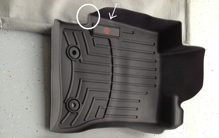 I installed my Weathertechs last night. I love the way they look and the overall fit. The only issue, though minor, is that the part circled in the pic is too far back and rides on top of the plastic of the gas door release housing. Because of that, the corner (where the arrow points to) does not go all the way down to the floor. It may not matter what-so-ever but I might trim a bit to make it fit better.