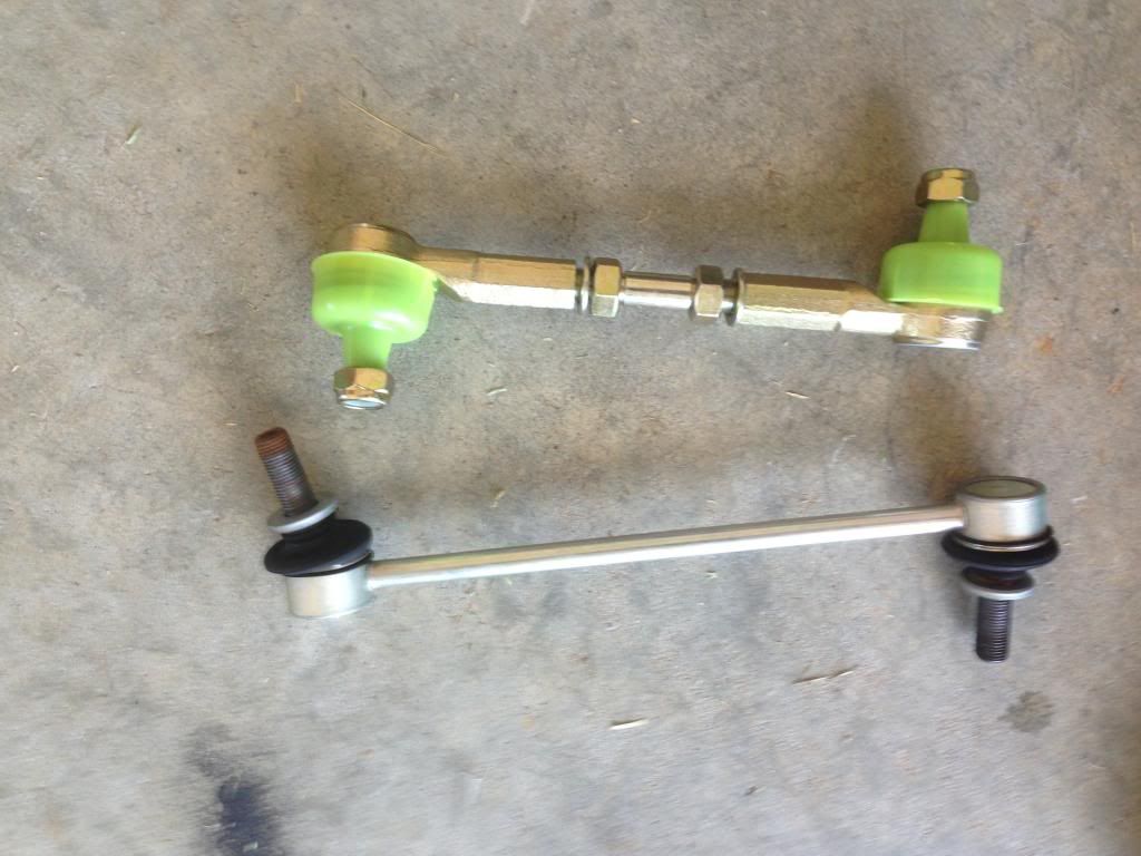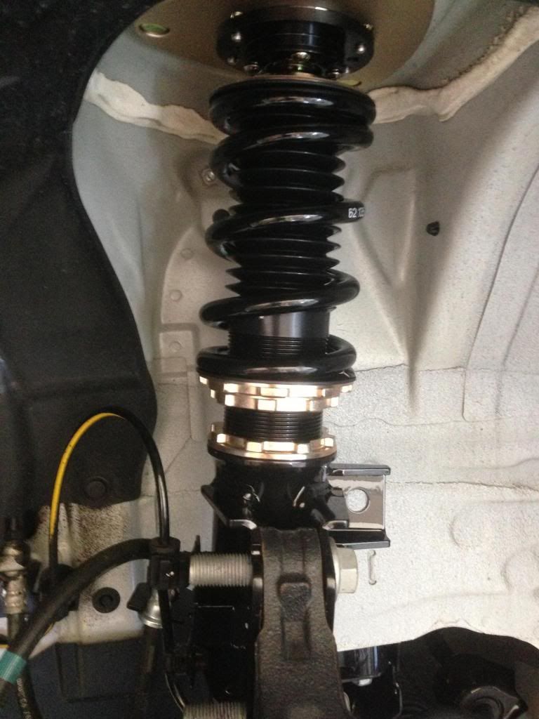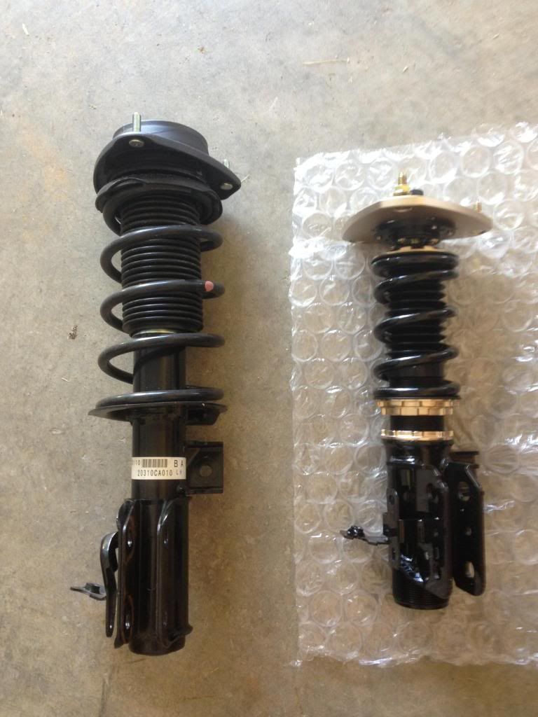 the day I got them. I couldn't tell at first but notice how the box has 10/10 ext, that means they are extreme lows.(I almost though they were reg BRs and almost got ) ![]() first impression of the packaging wasn't that great ![]() ![]() started with the front. this is the main setup w/ the wheel removed. the brake line and abs wires are bolted/mounted to the OEM strut. ![]() ![]() this is the OEM struts and end links compared to the BCs ![]() ![]() Be sure to mount the camber plates properly or you wont be able to adjust camber properly ![]() the BCs have mounting locations just like the OEM assembly ![]()