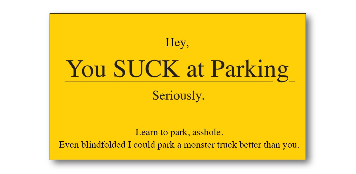 If cards get out your frustration so that there's no property damage then go for it. As for me, sometimes people just have a bad day, maybe they're just getting a burrito and will be back in five minutes and didn't want to waste time reparking (guilty, but nowhere near as bad as the ones posted), sometimes people are ass-holes and usually get what's coming in other forms. Think of the amount of stress those people get when a bird shits on their car or a rock chip, or whatever else 16 year olds in daddies BMW flip out about, they can keep their two spaces. |