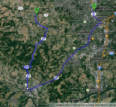 As much as I like the hills behind Newberg we won't be able to going that way. I already told the diner about what time we would be there. The map link I got from google maps. There is a box that will have a link just for the route that you make