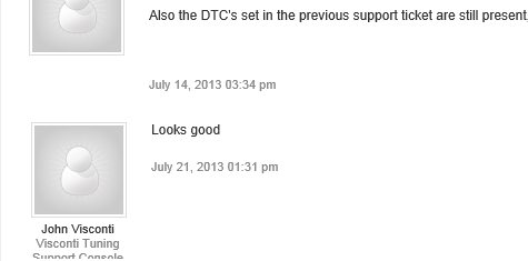 U0100 and some others for me, plus no where near the power advertised. Got "looks good". Requested fix/troubleshooting/acknowledgment there's an issue, to which he replied (after a month) that it "isn't his problem". Requested money back if they were unable to fix it, they refused. Started a paypal dispute; they called and said we'd "work something out" if I closed the dispute so I did. Now they've insinuated I'm a malcontent and a liar that waited "months after purchase" to complain, even after I showed proof that I complained about the issues IMMEDIATELY after I received the tune. Now they refuse to respond entirely, so more or less business as usual. If you can paypal dispute I'd recommend it. I'm now going to be forced to try a chargecard retract. Absolutely amazing customer service. "Stop whining you got what you paid for." Welcome to Visconti Tuning. Thanks for your $1325. |