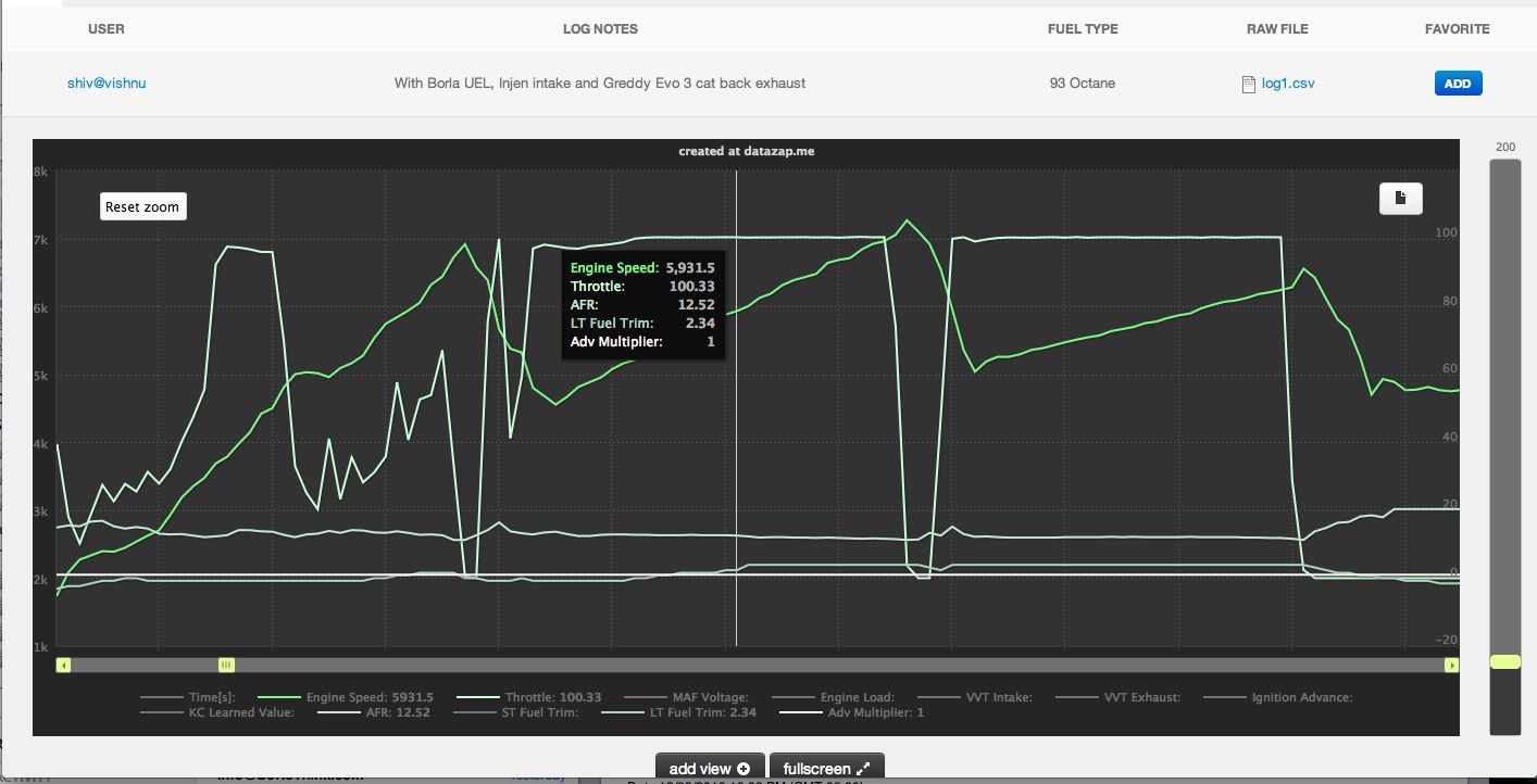 http://datazap.me/u/shivvishnu/openf...?1-2-7-9-11-12 Here's a screen shot of a zoomed in section showing a multi-gear pull: ![]() You can see that the throttle wasn't fully open for the 1st gear. So it's only really worth looking the 2nd and 3rd gear. During this section you can see that ignition advance multiplier stays at 1.0. Fuel trims are low and AFR is spot-on in the 12.5 - 12:0 range (getting towards the richer side of the range as revs increase) If view the log in the datazap link provided and plot ignition advance you can see that it's consistent in each gear with little to no mid-gear drop outs (knock retard). I'm not sure what more to say as the log is reasonably uneventful (meaning quite good). Hopefully the customer will chime in here and continue to post data
