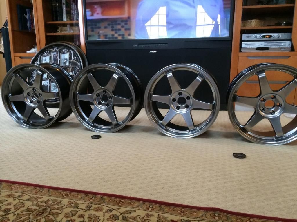 First off i order 4 Varrstoen es2.2.1 18x9.5 hyperblack wheels and when ordering these i then realize the day i receive them that they do not fit with stock springs(i'm getting coilovers later) so i decide to send back two of them so that the rear wheels will fit and then proceed to have a staggered wheelset so my front wheels are 18x8.5... so the day i receive those (after i sent back the other two) i look at them and they are two complete different shades.. One looks like a gray and one looks shiny silver. like so: ![]() and then i realize i might as well send back the 18x9.5's and just put on a square setup of 18x8.5's (hoping that they are all from the same batch) and i told the people i ordered from (aspec wheels) and sent them pictures. They received the 18x9.5's and sent me the second set of 18x8.5's... i now received them and sadly my luck is still slightly bad. The wheels look slightly different depending on lighting but thats only if you put them together like so: ![]() but in person they look quite similar, and i honestly don't know what i should do at this point so i decided to put them on and see if you people will really notice it. I'm hoping it won't be a major problem but i guess we'll see. I'm putting falken all season ziex 912's 225/40-18 on them another picture that makes them look all the same: