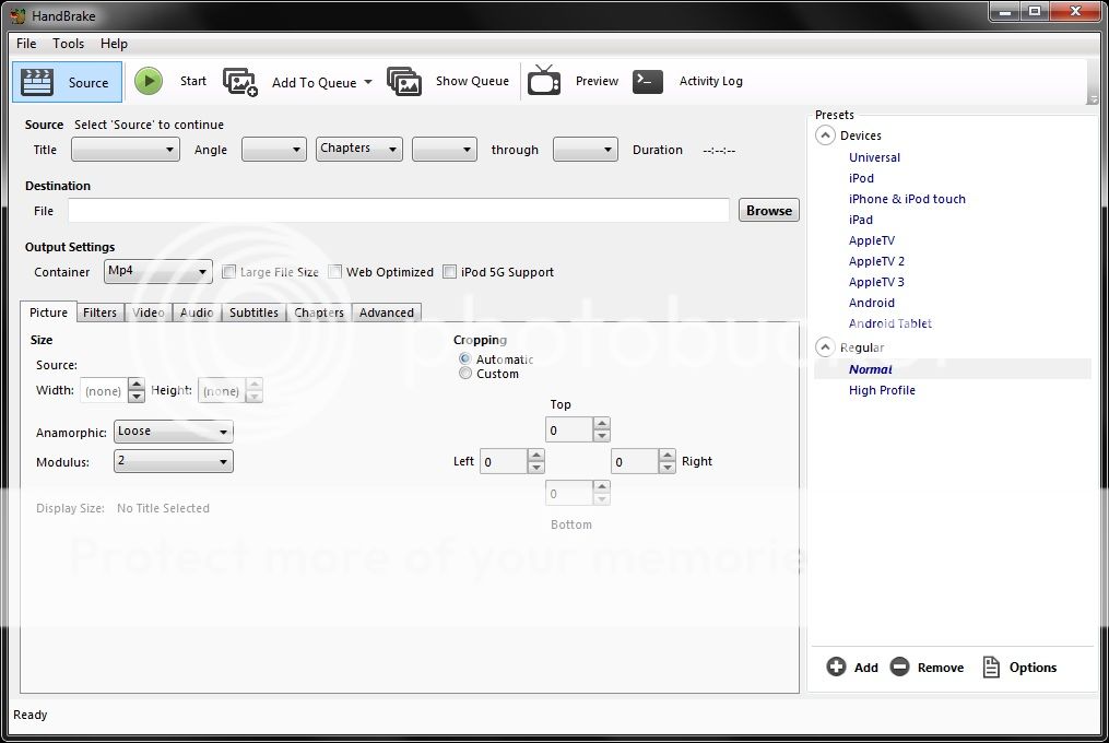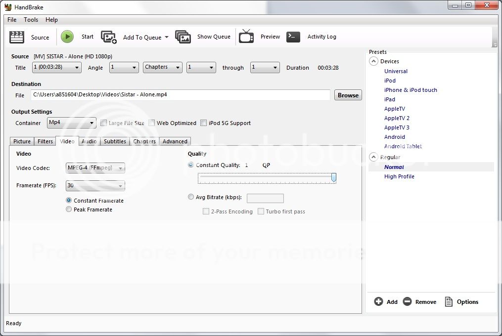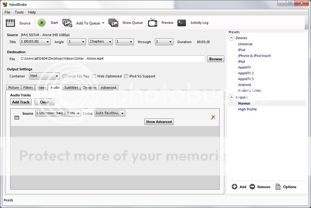 I decided to create a how-to for ripping Youtube videos and also for using Handbrake to convert the files to the correct format while also maintaining the best quality. These videos HAVE TO be played from USB. Our head units to not support video from the SD Card (At least according to the manual). I have not tried playing from the SD personally. There are many ways to download videos from Youtube but this is the easiest I could come up with for those who are not A/V nerds ![]() Reasons for using 640x368.. I realize the maximum resolution is 720x480, but 4:3 looks like shit, IMO. 640x368 is the largest 16:9 format I could get to work and the quality is near flawless. If you dig very large black boxes on the side of your video then use that setting. The quality will still be great. Let me know if I've missed anything and I will fix it promptly. I suppose this could be moved to the DIY section but since it's Audio related I put it here. 1.) Get Handbrake, install Handbrake! http://handbrake.fr/ 2.) Pick a youtube video Go to the video that you want and add "ss" after http://www. in the url. ![]() 3.) Download the 720p option When you get to the download page (You will be warned that it's a fishy site, continue past the warning. The site is fine). Chose the 720p option. ![]() 4.) Once the video is downloaded, open Handbrake and select the video from the "Source" option. ![]() 5.) Rename the file output correctly. Sometimes by default, Handbrake will name the file with a .mkv extension. Make sure to change it to .mp4 before continuing. Under the picture tab make sure to change anamorphic to "None" and change the resolution to 640x368 (See top of post for reason). ![]() 6.) Under the Video tab, change the video format to MPEG-4 and choose Constant Framerate, set it to 30. Most youtube videos are 30fps but some are 23fps, you will not notice the difference with the finished product. Also, set Constant Quality to 1 if it isnt already. ![]() 7.) Under the Audio tab, change the codec to be Auto-Passthru ![]() 8.) Hit start and the video will convert quickly. Things to note here, the final video is usually about 100 meg but can be as low as 30. If the quality is bad for some reason, try converting it again. I did have a couple that went low-res for an unknown reason and they should be perfect quality. Enjoy! Last edited by Starscream15; 01-28-2014 at 01:08 AM. |